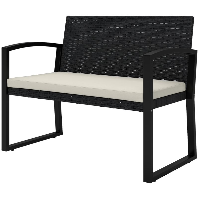Two-seater rattan bench: Plenty of space to sit and relax with company outdoors – garden bench is yet compact enough so it doesn’t take much space. || Padded seat cushions: Sit comfortably on this outdoor bench, with removable and washable cover for hygiene. High back and arms support you. || Steel frame: Powder coated and galvanised for extra strength, this park bench is a tough piece. Weather-resistant and suitable for year-round use outdoors. || Adjustable feet: Keep garden loveseat stable, even on uneven floors. || Dimensions: 78H x 103W x 58D cm. Seat: 41H x 95W x 45D cm. Maximum load 240 kg. Easy to assemble.