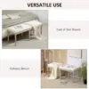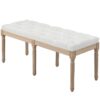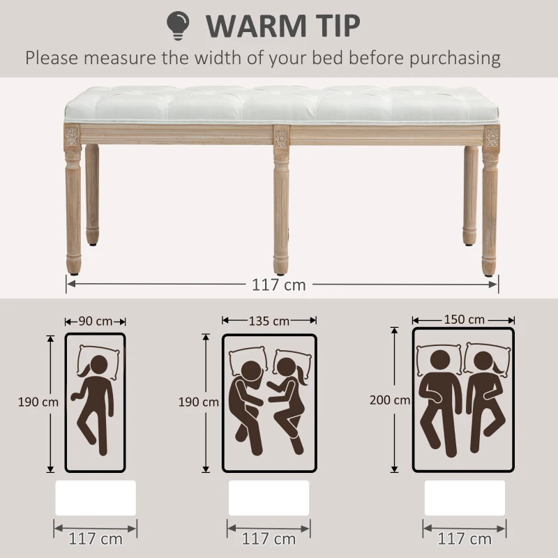 Cushioned seat: Thick padded top, with breathable linen-look upholstery – bed bench gives you a comfortable temporary seat whenever you || French vintage style: A traditional-looking frame with carvings all over – wood is brushed. Window bench is elegant and brings a touch of beauty into the home || Wooden frame: A strong core for the tufted bench, supports you when being used. Footpads gently protect floor against light marks and scratches || Versatile: Use as a shoe bench, as extra home seating, as a window seat or even to use with your double bed || Dimensions: 48H x 117W x 40Dcm. Maximum load 220kg. Assembly required It’s BS5852 qualified.