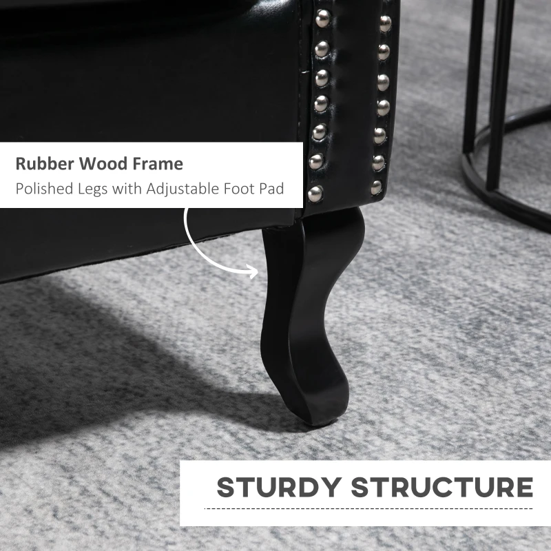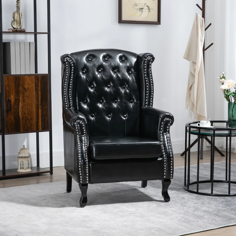 Chesterfield-style lounge chair: A traditional look, lounge chair brings a retro feel into your home and beyond. Metal studding for a chic touch. || Comfortable: This comfy chair is thickly padded all over. High back and armrests for support. Pocket springs for extra support and bounce. || Wooden frame: A strong core for this living room armchair, keeps you supported as you rest. This accent chair for living room has polished wooden legs. || Versatile: Use this occasional chair all over the home – bedroom, living room, hallway, in the sturdy and beyond. || Dimensions: 72W x 70D x 108Hcm. Seat: 48W x 48D x 44.5Hcm. Maximum load 150kg. Assembly required. Made from flame retardant materials.
