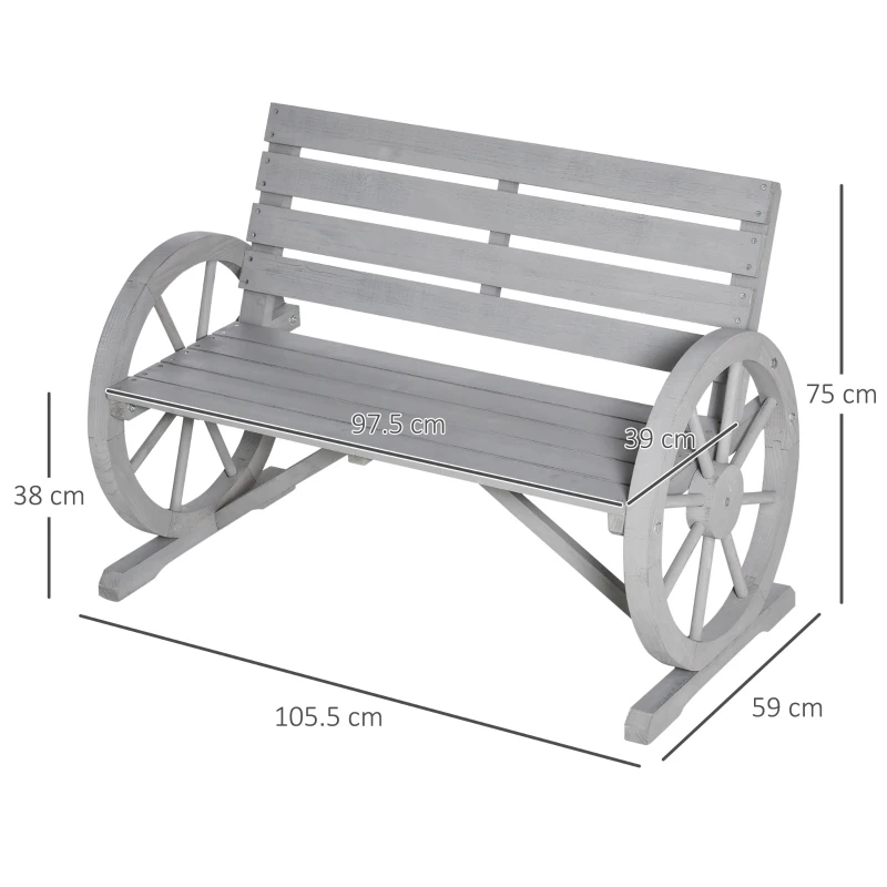 WAGON WHEEL ARMRESTS: An individual touch to bring unique style into your garden, patio and other outdoor areas. A conversation starter between you and guests. || FIR WOOD STRUCTURE: Strong formation, suitable for outdoor use. High back and armrests offer body support as you sit. || SLATTED SEAT: Fixed panels of wood create space for water and whatever else to pass through to the floor – helping to keep the bench dry to sit on. || DIMENSIONS: 75H x 105.5L x 59Wcm. Seat: 97.5L x 39Wcm; Seat to floor: 38cm. || MAXIMUM LOAD 250KG. ASSEMBLY REQUIRED.