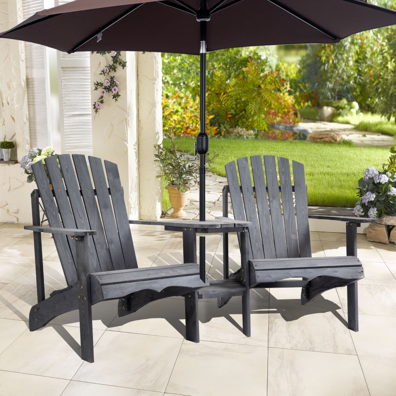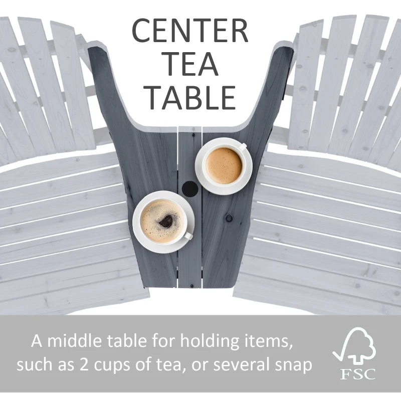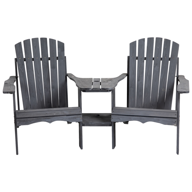 CONNECTED CHAIR AND TABLE: Two seats, with a table in the middle, the Adirondack chair giving you a place to relax with a friend and a handy holding place next to you. || ADIRONDACK STYLE: The traditional wooden garden chairs, comfortable and ergonomic shape with the wide seat, rolled end and high back and armrests for support. || FIR WOOD: A solid structure, that holds and supports your body, with a protective paint coating, making these wood deck chairs suitable for use outdoors. || PARASOL HOLE: Found on the table, holds your garden umbrella to keep you protected in the sun. 5cm diameter. DIMENSIONS: 94H x 170L x 87Wcm. Seat: 55W x 52Dcm. || MAXIMUM LOAD 120KG. ASSEMBLY REQUIRED.