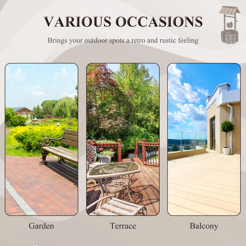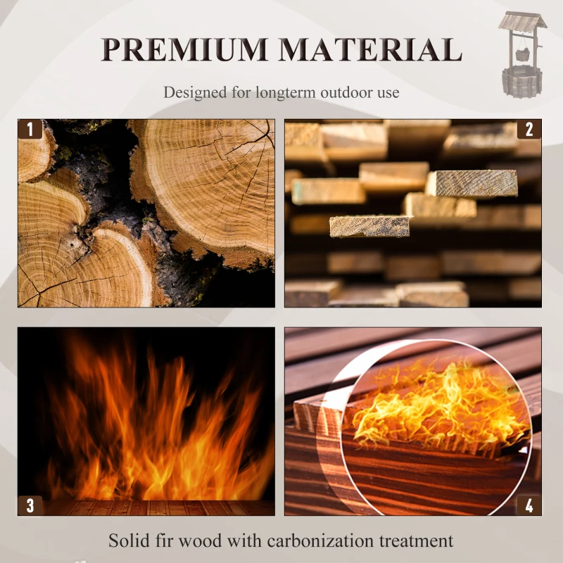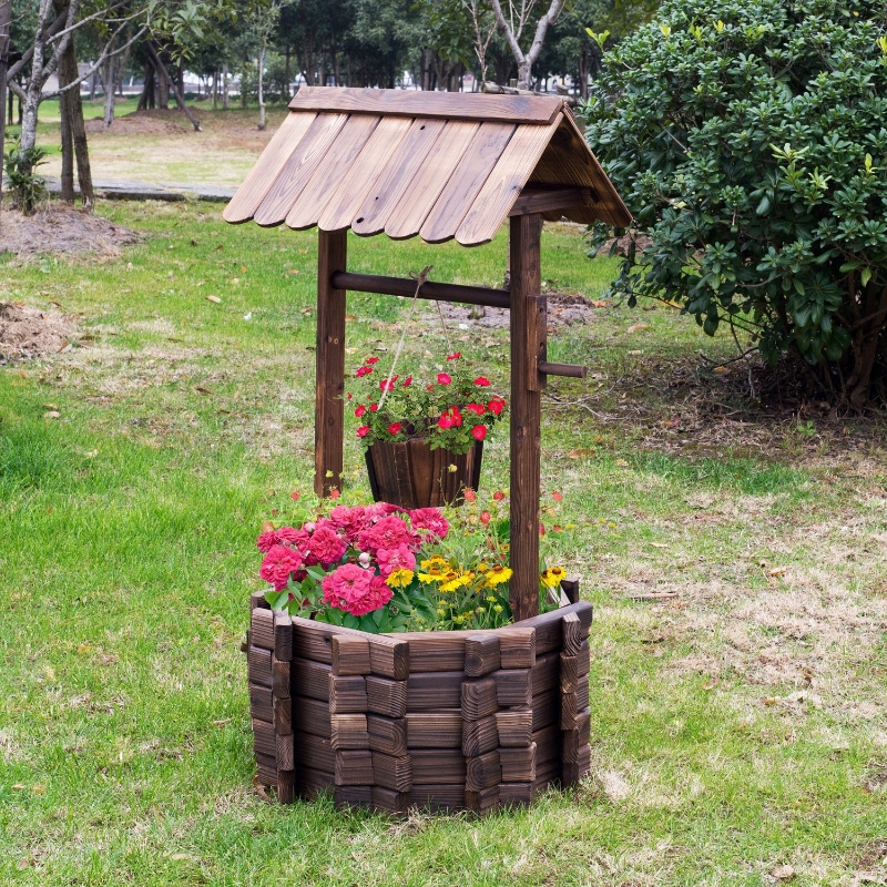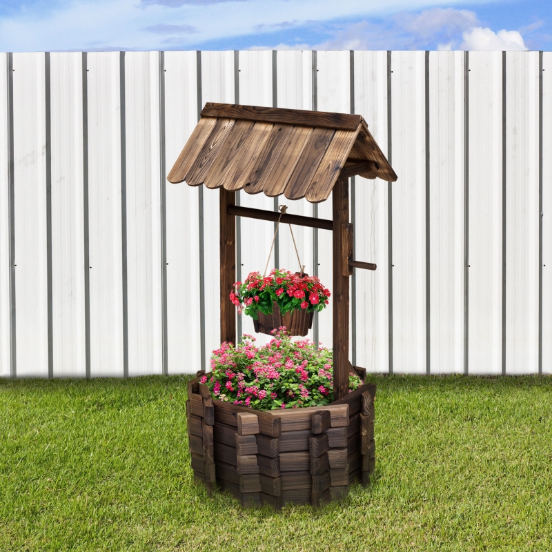 Burnt-like wood finish gives a rustic and stylish appearance to the planter || Solid fir wood keeps this planter durable and long-lasting || Large well and small bucket are designed to hold multiple plants at once || Includes a string rope to hang the bucket low or high as per your preference || Overall Size: 60L x 55W x 114H cm. Assembly Required.
