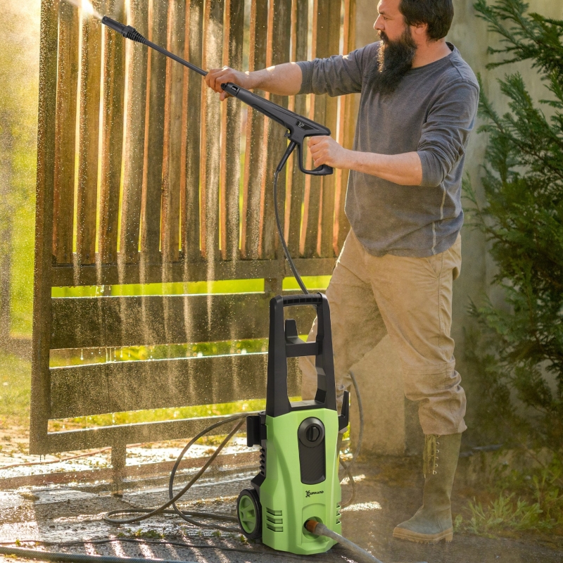 Multi-use power washer: Clean surfaces and get rid of dirt, dust and stains. Jet washer, is suitable for vehicles, outer walls, deck floors, outdoor furniture, garden fences and so much more. || Complete pressure washer kit: Car washer comes with a spray gun, a wand, a hose, an inlet adaptor, a snow foam bottle, nozzle and nozzle cleaner. Integrated gun, hose, and power cord to keep everything neatly in one. || 1800W motor, maximum 150 bar pressure: A high pressure washer, helping you to complete cleaning tasks efficiently. Provides 510 litres of water hourly. || Automatic stop: When the trigger is not engaged, the pump automatically shuts off for safety. || 0°-75° adjustable nozzle angle: Adjust the spray angle as needed to keep your hand in a comfortable position.