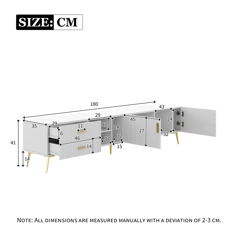 Contemporary style: This rectangular TV cabinet features decorative vertical stripes on the doors and gold metal legs, aligning with a light luxury aesthetic. || Sturdy and durable construction: Made from high-quality MDF, the TV stand offers excellent durability and support, with a spacious tabletop that can hold up to 50 kg and cabinet shelves supporting up to 10 kg. || Ample storage space: Equipped with 2 pull-out drawers, 2 closed cabinets, and 3 open storage compartments, this TV stand provides plenty of space for DVDs, books, and other everyday items. || Suitable for any space: This farmhouse-style console with vintage metal knobs fits seamlessly into modern spaces, making it a versatile piece for kitchens, dining rooms, living rooms, and bedrooms. It can be used as a buffet, TV stand, or sideboard. || Easy to assemble: The TV stand measures 180L x 35W x 41H cm and comes in 2 packages with clear instructions, hardware, and tools for straightforward assembly.