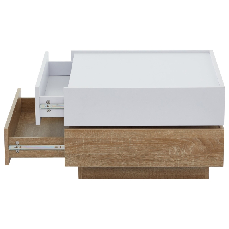 Square Rotating Coffee Table with 2 Drawers and Swivel Top, 2-Tier Centre Table with Storage, 60L x 60W x 38H cm, White+Oak