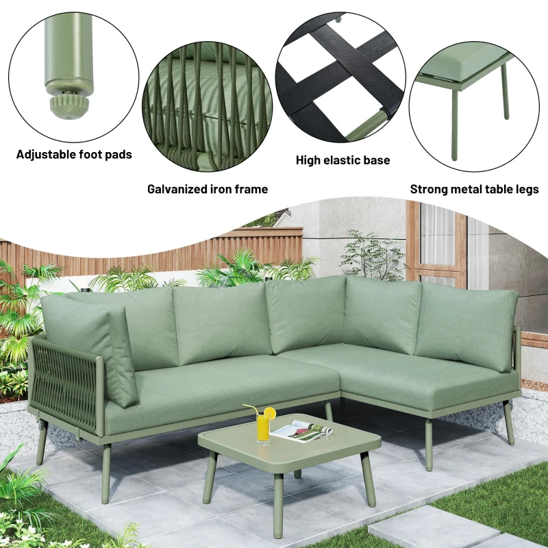 UV-Resistant Garden Lounge Set with Glass Coffee Table, Thick Cushions, L-Shaped Corner Sofa for 4-5 People, 120L x 60W x 86H cm, Green quantity