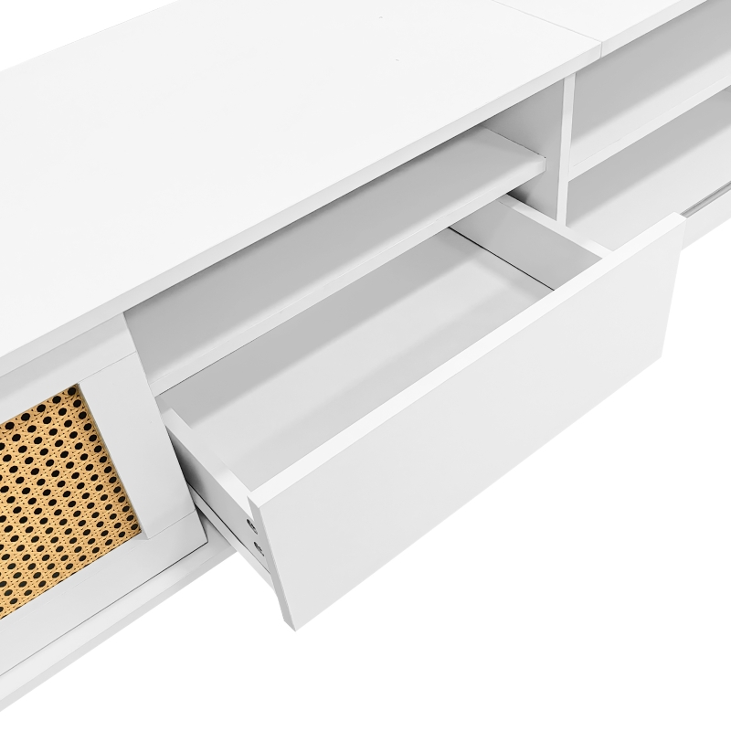 Natural Walnut Modern TV Stand with Rattan Drawers, Solid Wood Doors and Storage Solution, 170×39.5×46 cm, Natural