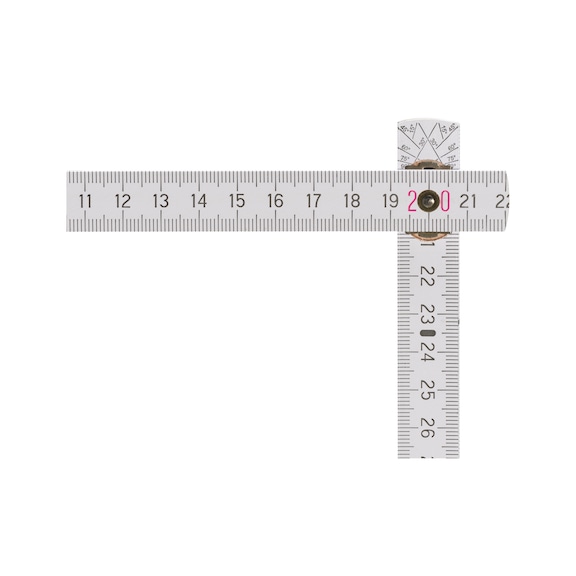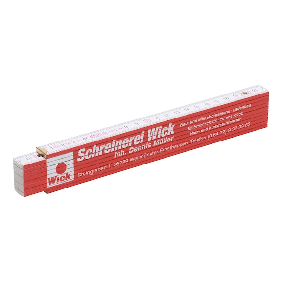 Inside hinges | Wooden rule, 2 m | Does not bend and always lies straight when measuring | Suitable for one-colour or multi-colour digital printing to suit customer requirements | Any information can be printed, including images | Internal hinges | Folding metre rule can be used as a ruler — larger advertising surface | Standard angle impression on 2nd joint | No additional goniometer required | EEC type approval, accuracy class III
