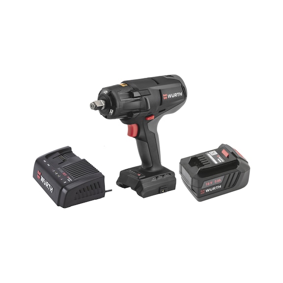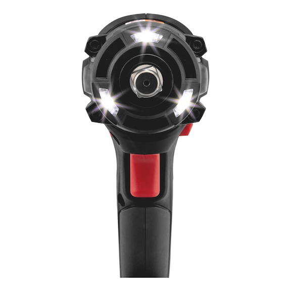 Triple LED on the gear head provides optimum illumination of the working area | Three power levels plus an additional automatic mode that shuts down the motor when the impact mechanism is started, thus minimising the risk of damage to the screw connection | High rotation speed and impact frequency result in a higher breakaway torque of up to approx. 800 Nm, which also enables jammed wheel nuts to be loosened | The brushless motor with overload protection is low-maintenance, durable and powerful | Effortless and user-friendly working due to the compact and lightweight design with rubberised handle | No recoil or torque effect on the wrist | Triple LED on the gear head provides optimum illumination of the working area | Notice | Impact wrenches are not torque drivers. Connections requiring a specific torque must be checked by means of a torque measuring device after tightening with the impact wrench. Use hearing and eye protection. | Application area