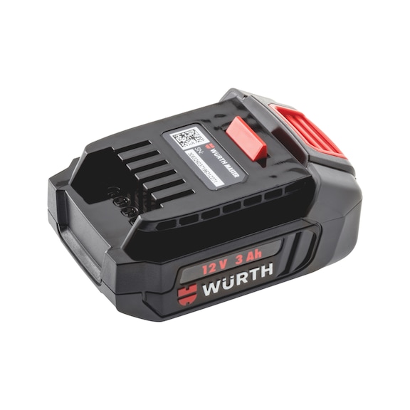 Compact, powerful and long-lasting 12-volt Li-ion battery for professional and universal use with the new Würth cordless tools | Integrated, robust cell frame surrounds the cells | Ensures a secure fit and optimum heat dissipation, protecting the battery from overheating and shock. | Robust housing with soft components | Provides additional protection against drop damage and reduces the risk of damage to the surfaces of workpieces to be processed. | LED charge level display | Continuous monitoring of the remaining battery capacity.