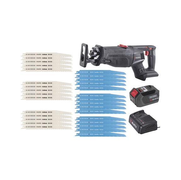 Powerful and robust M-CUBE cordless sabre saw including 5Ah battery, UK plug charger and 30 sabre saw blades.