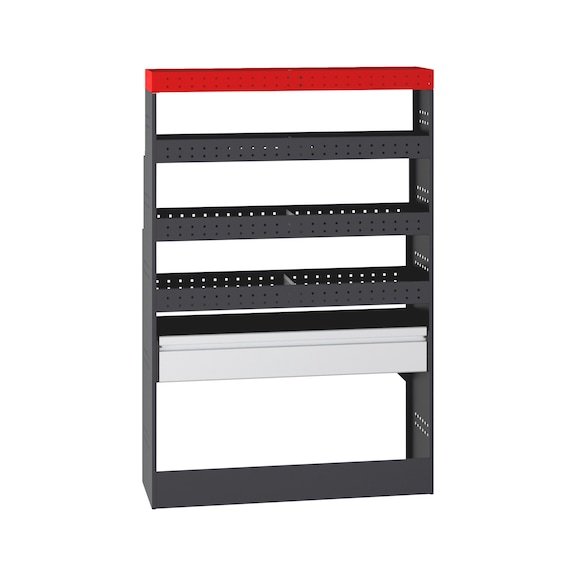 One top frame with separating plate | Substructure with panel, clear height 480 mm | One flap shelf (flap height 180 mm) | Three storage racks, each with one separating plate for clear and orderly storage of tools and small parts | One top frame with separating plate | Made of high-strength steel with high-quality powder coating | Includes non-slip mats | Includes side and floor mounting kits | Notice | Floor panel not included in the scope of delivery.