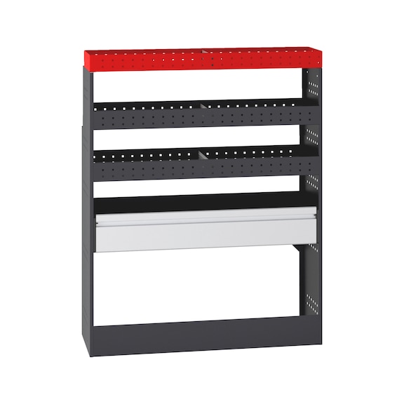One top frame with separating plate | Substructure with panel, clear height 480 mm | One flap shelf (flap height 180 mm) | Two storage racks, each with one separating plate for clear and orderly storage of tools and small parts | One top frame with separating plate | Made of high-strength steel with high-quality powder coating | Includes non-slip mats | Includes side and floor mounting kits | Notice | Floor panel not included in the scope of delivery.