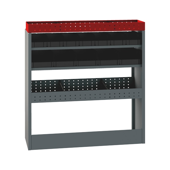 Premounted and ready for installation | Suitable for many different vehicle types | See assignment table | Comprising: | Substructure with panel | Subassembly clearance: 390 mm | Storage rack | For clear and orderly storage of tools and small parts | Two storage racks | With five storage boxes (size 2) | With 7 storage boxes (size 3) | Clear and orderly storage of small parts | Top frame | Made of high-strength steel with high-quality powder coating | Includes non-slip mats and separating plates for storage rack and top frame | Includes mounting kit
