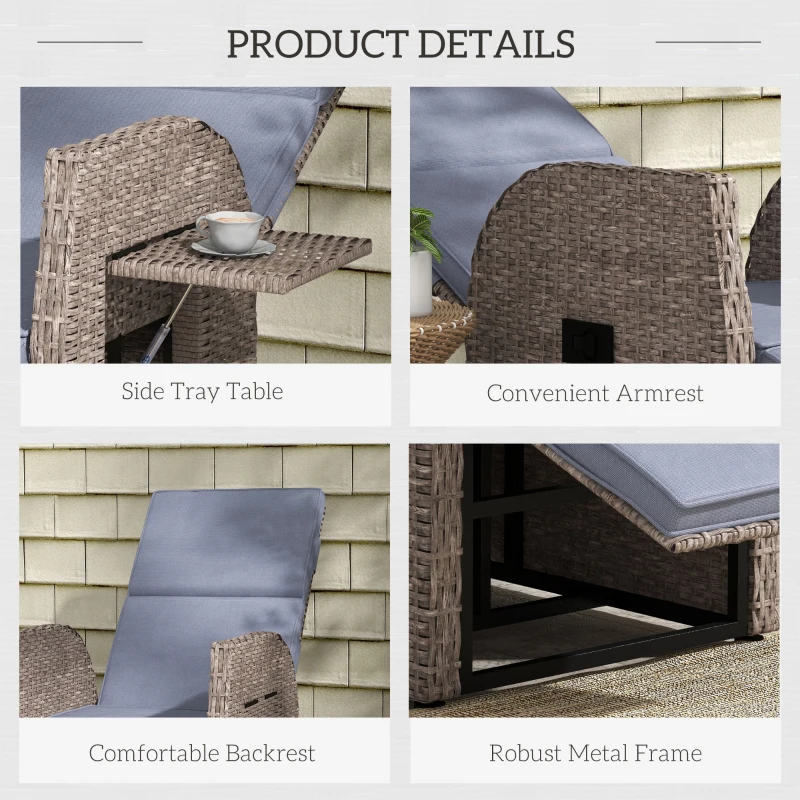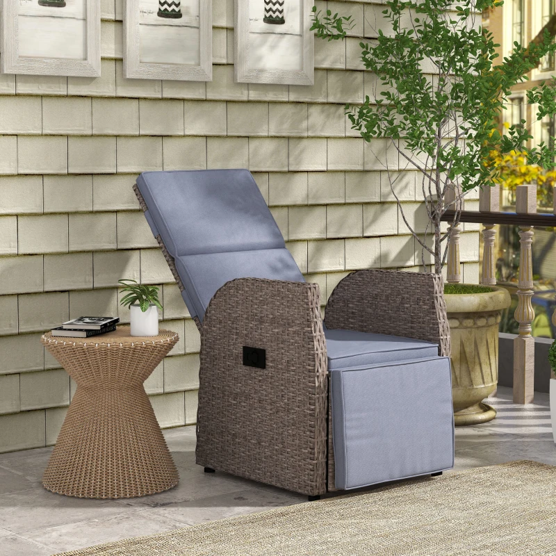 148° reclining back, with footrest: Set this recliner garden chair to a position you want. Elevate lower body too. || Cushion seat: Keep comfortable on this reclining rattan chair, for as long as you’re seated. || Side table: Keep items close to you when seated in this outdoor recliner chair. || Steel frame, wrapped in rattan: A strong core for this garden chair with footrest. Plastic wicker top layer is stylish and protects the metal. || Dimensions: 105H x 57W x 59Dcm. Seat height: 41cm. Maximum load 160kg. Assembly required.