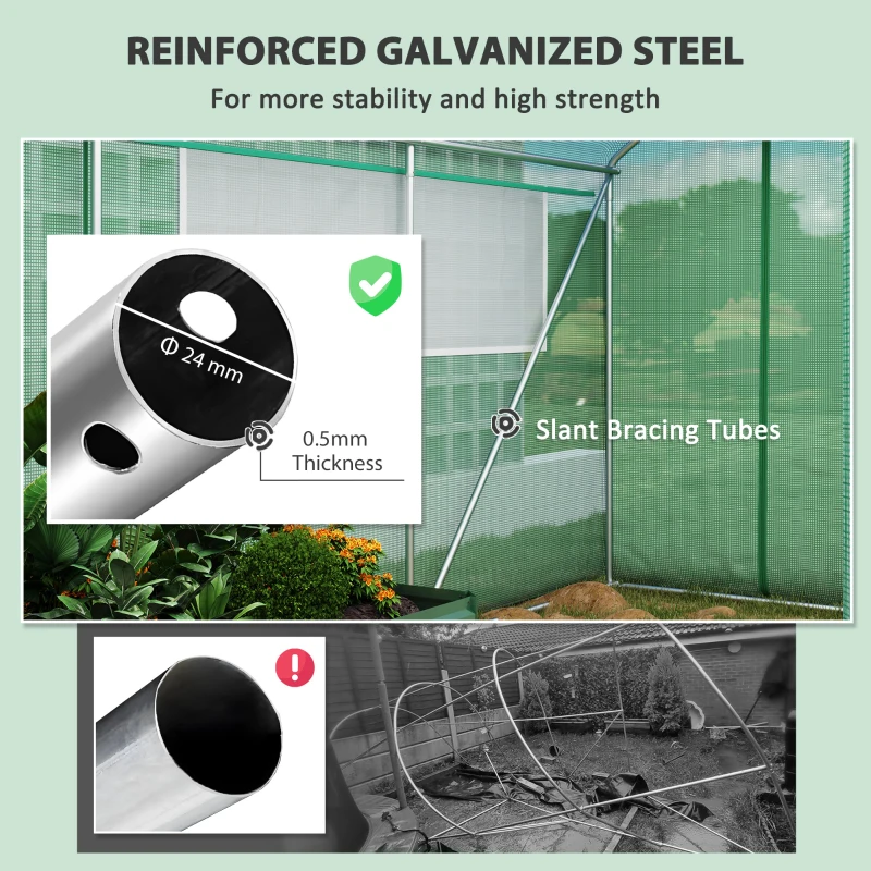 Multiple doors and windows: A spacious design to hold plenty of plants and flowers. Three roll-up doors for easy access, with six mesh windows to allow fresh air inside. || 140 gsm plastic cover: With a middle reinforcement grid – a protective shell for this polytunnel greenhouse. UV resistant and shields against light weather – plants grow to their best. || Steel frame: Galvanised for extra strength to ensure a strong core. Slanted bracing tubes, four ground stakes and four guy ropes also included – extra stability for this walk-in greenhouse. || Walk-in design: A large, open garden polytunnel – offering plenty of room for room for growing many plants, flowers and more. Open design allows you to set up inside how you want. || Dimensions: 200H x 594L x 300W cm. Front door: 180H x 160W cm. Side door: 150H x 117W cm. Windows: 40H x 159W cm/40H x 47W cm. Assembly required.