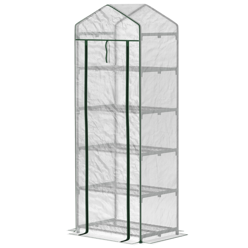 193cm compact design: An easy way for you to grow plants, vegetables, flowers and more. Small greenhouse can be used almost everywhere, both indoors and outdoors. || Five tiers: Plenty room to grow and organise plants in this mini greenhouse. Grid shelves prevent water and liquids building up and causing damage to the structure. || Plastic cover: Outer of garden greenhouse protects plants from cold, whilst allowing sunlight to reach inside for nourishment. Zipped door for easy access. Extended edges to bury in the soil for stability. || Steel frame: Powder coated for extra strength – ensures outdoor portable greenhouse has a solid structure which keeps itself in shape. || Dimensions: 193H x 69L x 49W cm. Maximum load 15 kg per shelf. Easy to assemble – 1/2 people required.