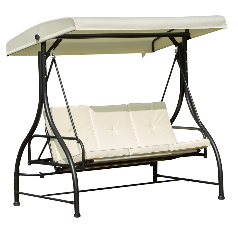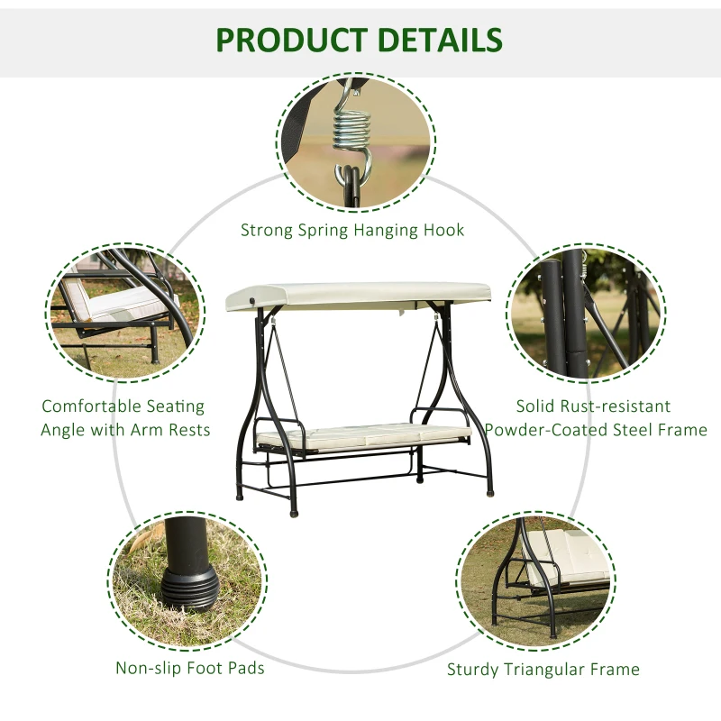 STURDY AND STABLE: Constructed by sturdy metal frame offers sufficient space and big weight capacity for 3 persons use || 2 IN 1 DESIGN: Working as a canopy swing chair and a 1 person hammock bed when you lay it down || SOFT & COMFORTABLE: Thick padded cushion (not washable) offers extra comforts and covered by 180g/m2 polyester fabrics || ADJUSTABLE CANOPY: Coming with a big Canopy on the top of it for mild wind and UV protection. The canopy angle can be adjusted to provide more shaded || Overall Size: 196L x 117D x 178H (cm)