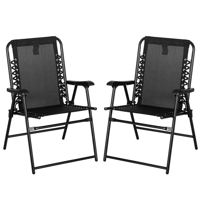 Best 2 Pcs Patio Folding Chair Set, Outdoor Portable Loungers for Camping Pool Beach Deck, Lawn w/ Armrest Steel Frame Black