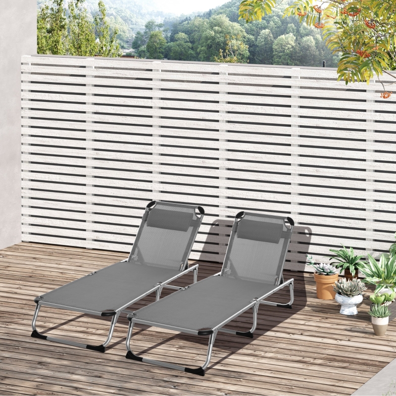Best 2 Pieces Foldable Outdoor Sun Lounger with Pillow, 5-Level Adjustable Reclining Lounge Chair, Aluminium Frame Camping Bed Cot, Grey