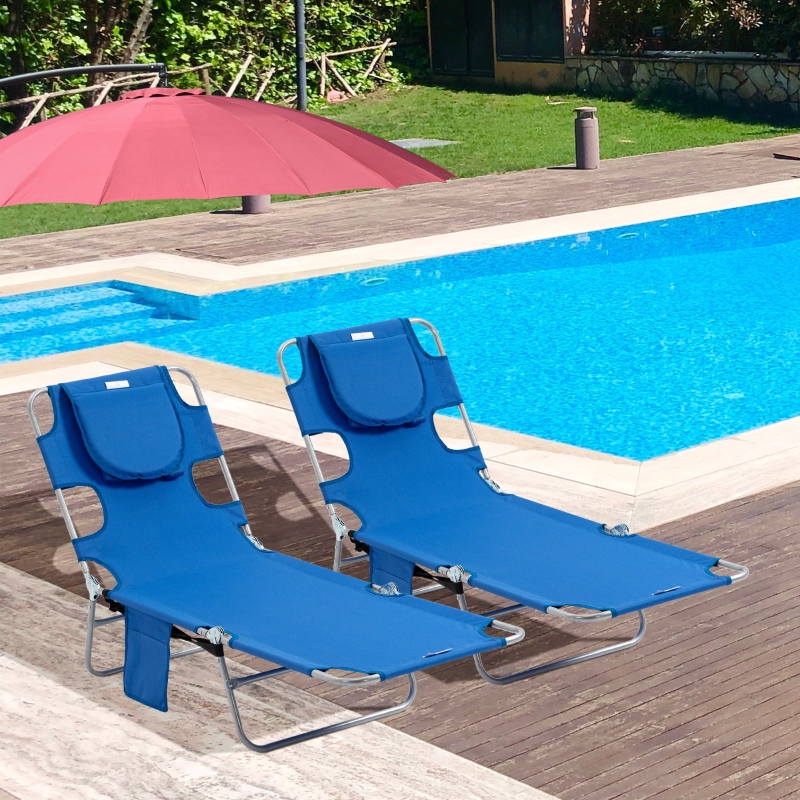 Best 2 Pieces Foldable Sun Lounger with Reading Hole, Portable Sun Lounger with 5 Level Adjustable Backrest, Reclining Lounge Chair with Side Pocket, Headrest Pillow, Blue