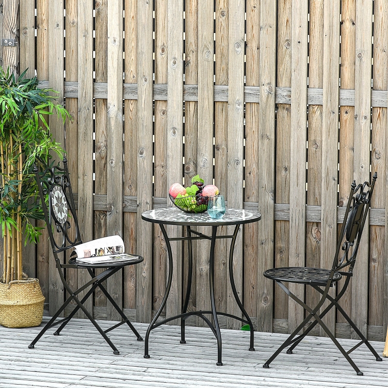 THREE PIECE BISTRO SET: Includes a small round table and two folding chairs. The small and compact size of the mosaic bistro set is ideal for gardens, balconies, patio areas and other outdoor areas. || MOSAIC DESIGN: Beautiful ceramic tiles on the top of these bistro table and chairs, adds a touch of elegance to your dining. || METAL FRAME: Sturdy and solid, our bistro sets for 2 for garden are suitable for everyday use. Grid cut-out on chairs prevents water build-up. Scrolling on the chairs for extra beauty. || FOLDING CHAIRS: Easy to move and store. || DIMENSIONS: Table: 71H x Ф60cm. Chair: 95H x 50W x 43Dcm. || MAXIMUM LOAD: Table: 50kg. Chair: 100kg. || TABLE ASSEMBLY IS REQUIRED.