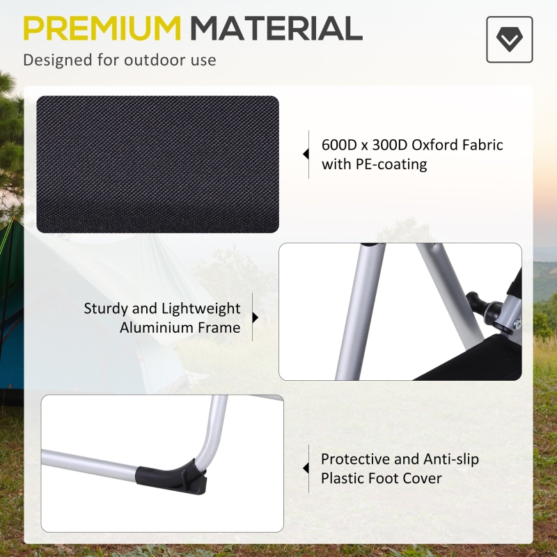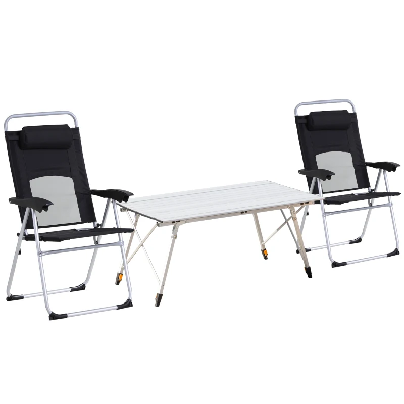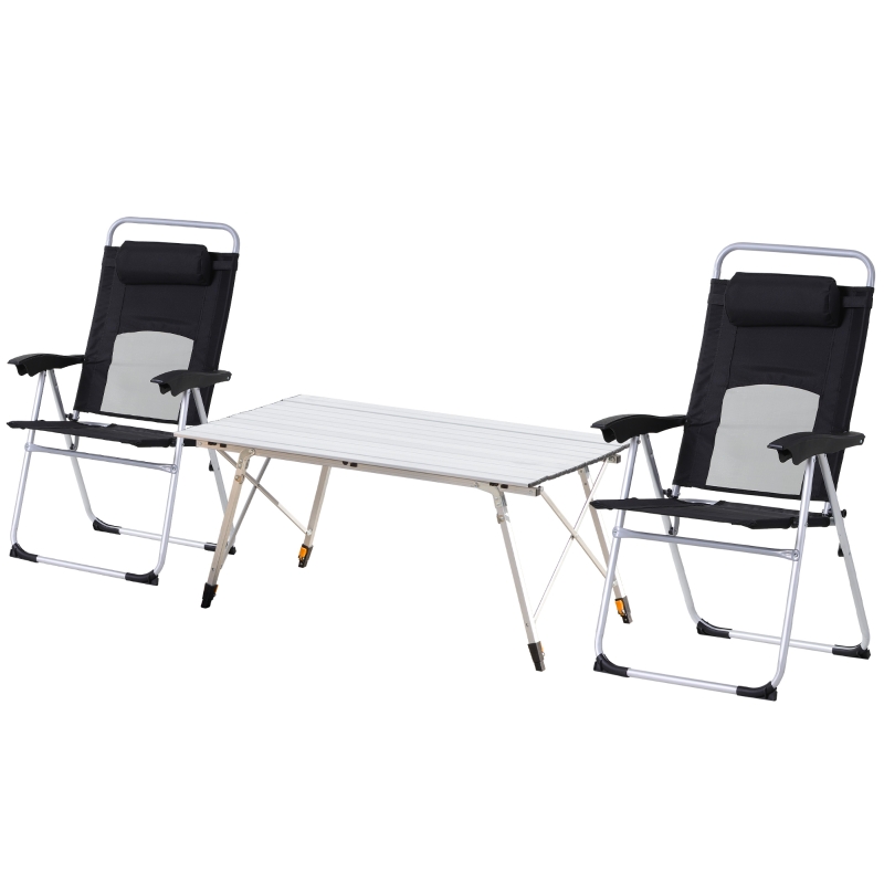 Portable design: The camping table comes in two parts: the roll-up tabletop and the bottom frame – easy to assemble and carry. The camping chairs are foldable and lightweight. || Adjustable back portable chair: Reclines to three levels, allowing you to be in control of your comfort. || Height adjustable picnic table: With four legs extending between 59-78cm, you can set it to a height which suits, with a rubber pad on each leg to keep it balanced and level. || Metal frame camping chairs: Heavy duty to provide strength and support whilst seated. Aluminium body outdoor table: Lightweight yet robust, it is resistant to rusting, scratching and water damage. || Fold up Table Dimensions: Whole: 120L x 69W x 59-78Hcm. Folded: 121L x 17W x 14Hcm. Camp Chair Dimensions: Whole: 109H x 57W x 62Dcm. Folded: 86H x 19L x 18Wcm.