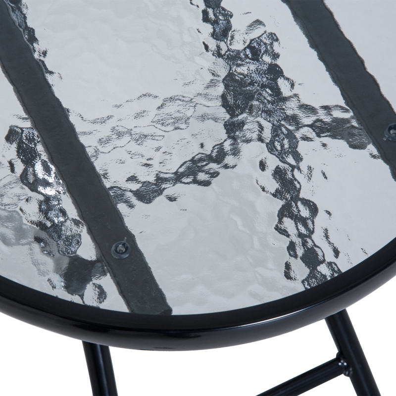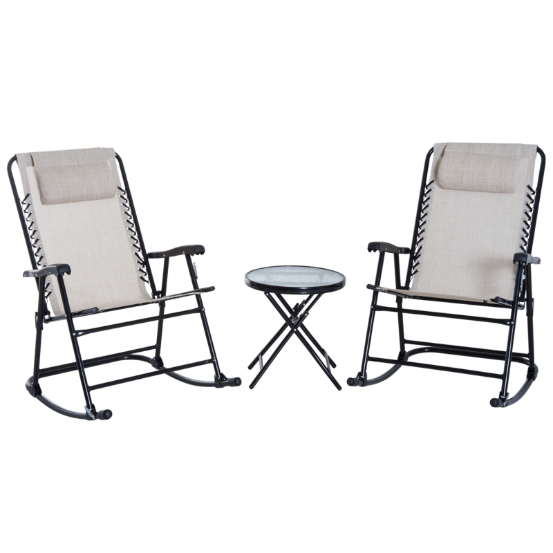 ROCKING CHAIRS: Frame bottoms are made into a smoothly curved shape – moves forwards and backwards gently. A great addition to Porch, balconies, poolside, and other indoor or outdoor areas. Can be folded to carry/store. || THREE-PIECE GARDEN SET: Comes with two outdoor chairs and a matching round table. A great addition to any space you rant to relax – with company. || TEMPERED GLASS-TOP TABLE: Sleek look, a safe and easy holding place. Great for keeping food, entertainment and drinks close to you. || FABRIC SEAT: Supports your body, elastic cords connect to the frame and hold you steady. Padded pillow for comfort. || DIMENSIONS: Chair: 68W x 90D x 106Hcm. Folded: 68L x 114W x 16Hcm. Table: Φ46 x 49Hcm.