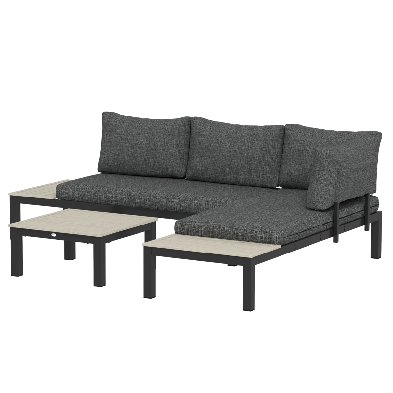 Three-piece set: Stylish garden furniture sets, include a two-seater sofa, a chaise lounge and a matching coffee table. Seats up to three people with plenty of room. || Aluminium frame: The outdoor corner sofa has a solid and stable base for long term use in your garden, natural lightweight and resistant to mild weathering and rusting for longevity outdoors. || Thick cushions: The garden furniture’s plush padding for you to sit down and sink into them for unrivalled comfort. Removable and washable covers which are resistant to light water and stains. || Square coffee table: The square table of the aluminium garden sofa provides surface space to keep everything you need close to you without moving. Extra space on the end of both sofas. || Dimensions: Sofa: 69H x 164W x 74Dcm. Sofa seat: 134W x 67Dcm. Table: 32H x 63W x 63Dcm. Maximum load weight 220kg per sofa. assembly required.