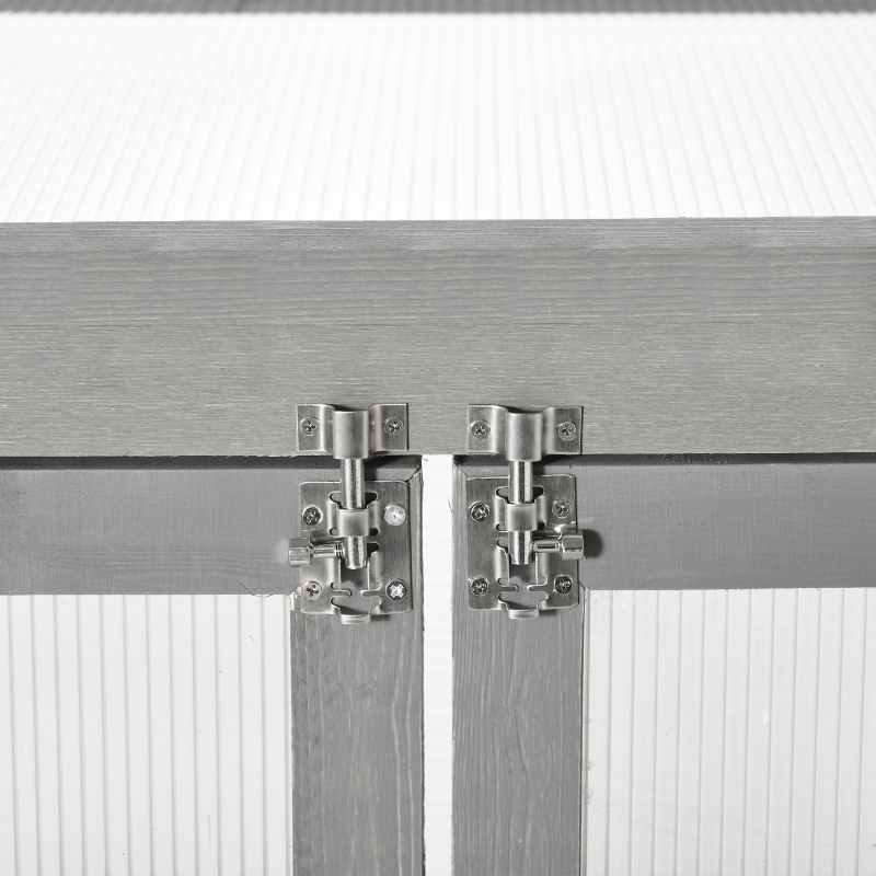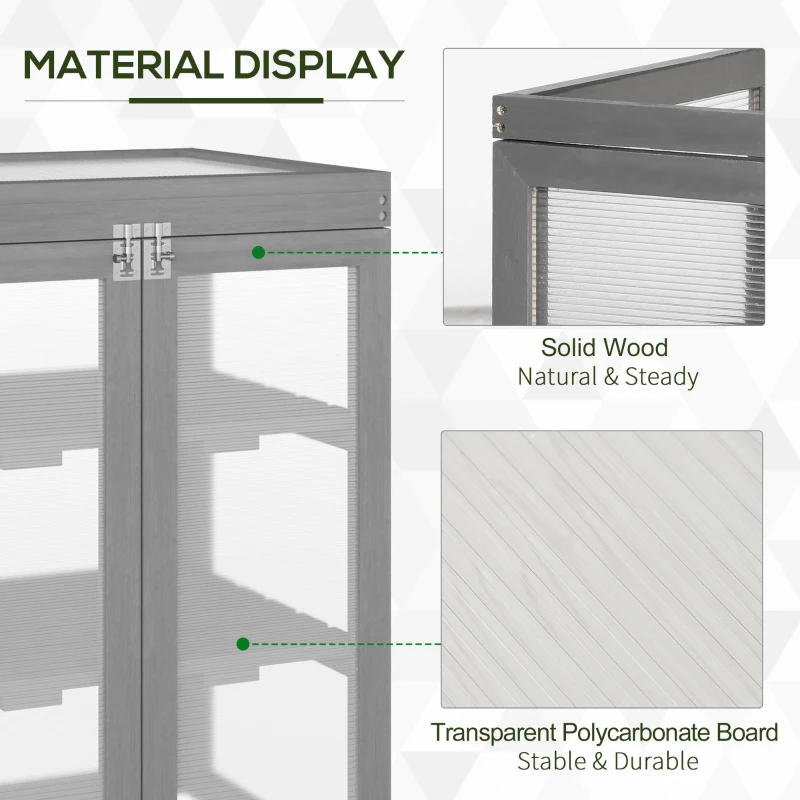 The small wooden greenhouse is made from fir wood and polycarbonate panels, with a top access opening and double doors for its forwarding opening || This wooden mini greenhouse will extend growing season and protect young plants from frost; The gardening cold frame’s UV proof polycarbonate walls with flip-top hinged lid || The polycarbonate greenhouse comes with 2 slatted wood shelves for added storage space. The shelves can be moved so that the cold frame can fit tall plants well. || Galvanized metal parts of the small greenhouse are rust proofing || Overall Dimension: 58L x 44W x 78H (cm); Assembly required