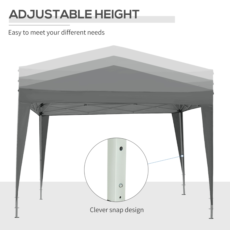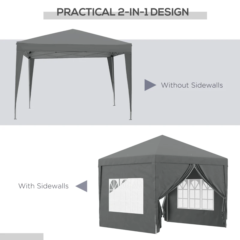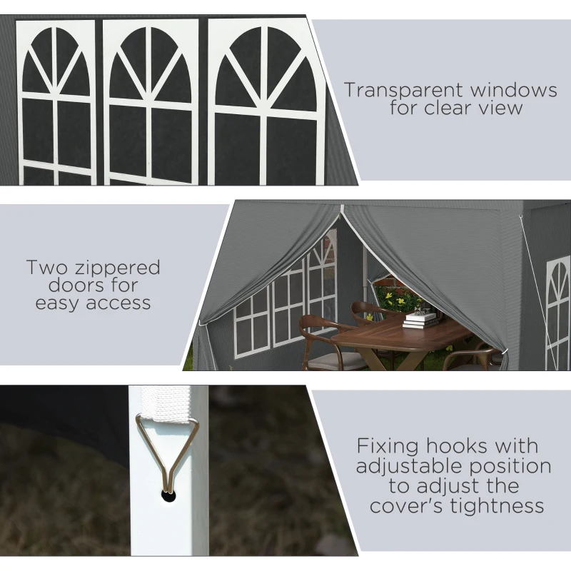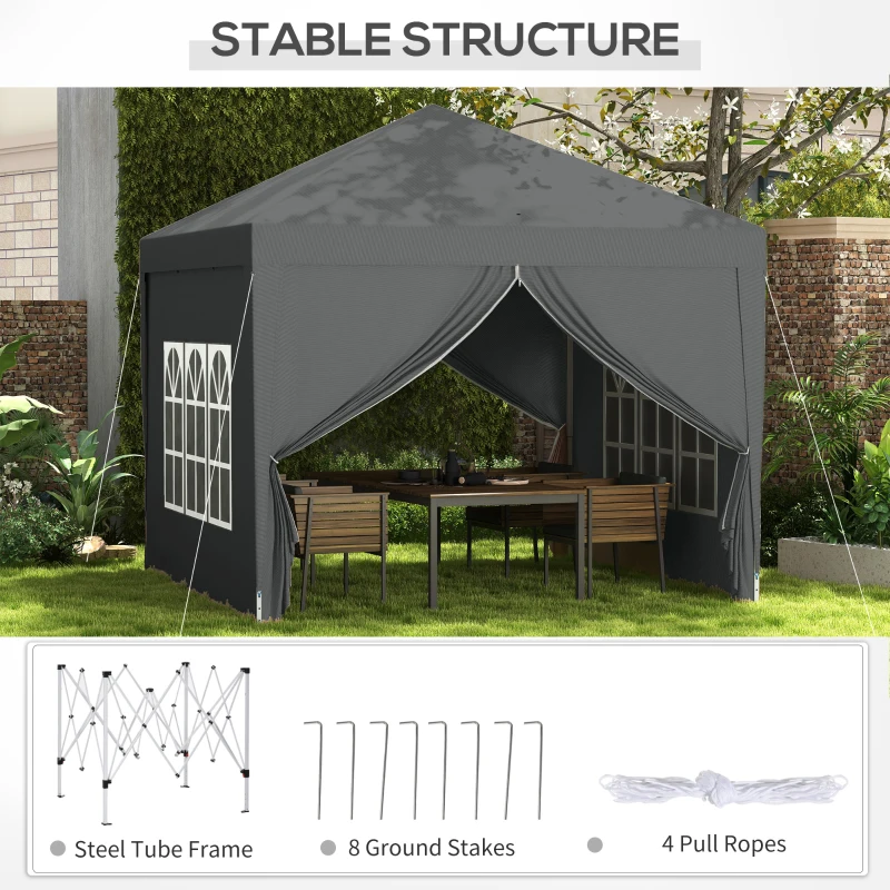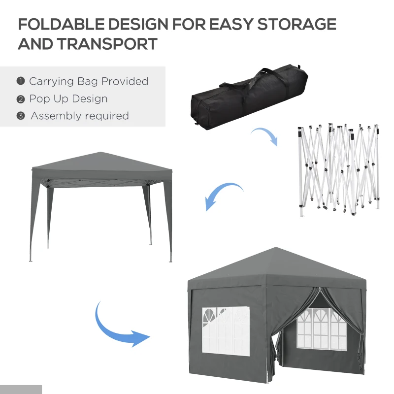 Easy, pop-up design: A garden gazebo which goes up quickly, saving you plenty of time to focus on setting up your party. Suitable for practically any outdoor gathering. A carrying bag for easy storage and transport. || Four removable walls: Pop-up tent can create an open or private feel. Walls come with zipped doors and windows. || Steel frame: Powder coated for extra strength, this is a strong core for this garden shelter. 3m x 3m gazebo with sides comes with 4x guy ropes and 8x ground stakes to pin to the ground. || Weather-resistant canopy: Silver-colour-coated oxford cloth creates a UV and weather-resistant shield, helping avoid the weather when standing inside this party tent. Eight drain holes at the top help prevent water build up. || Dimensions: 2.95 x 2.95 m x 2.58m. Removable wall: 1.96Hm. Two people required to assemble. ALWAYS takedown your canopy in heavy wind or rain. Always use the included stake and the guy ropes provided when it is used.