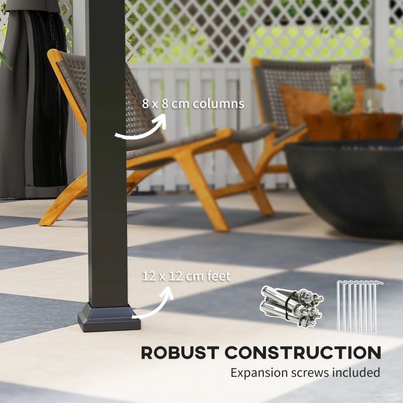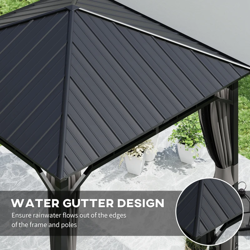 Weather-resistant metal roof: Galvanised metal roof is UV and waterproof, water gutter design ensures rainwater flows out of the edges of the frame and poles. With a snow load capacity of up to 80kg/㎡. || Robust metal construction: This heavy duty gazebo has a strong 8 x 8 cm metal frame, included expansion screws to mount pre-drilled feet to hard ground. Stable standing in winds up to 61-72km/h. || Enhanced privacy: Comes equipped with curtains and netting sidewalls, making this metal gazebo with sides great for private gatherings or enjoying tranquil outdoor moments. || Decorative Ceiling Hook: Equipped with a ceiling hook, this patio gazebo allows you to hang lights, fans, or decorations, transforming it into a personalized pavilion gazebo. || Spacious and accommodating: Measuring 300 x 300 x 287 cm, this permanent gazebo covers 9㎡ and comfortably fits 6 people for social events. We recommend assembling this waterproof gazebo with three people.