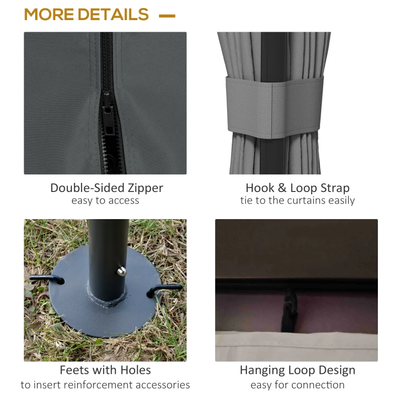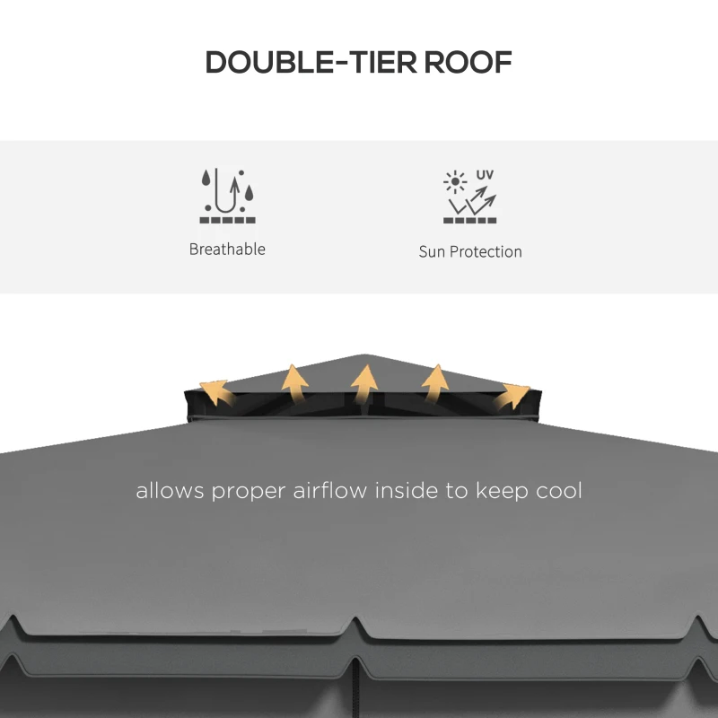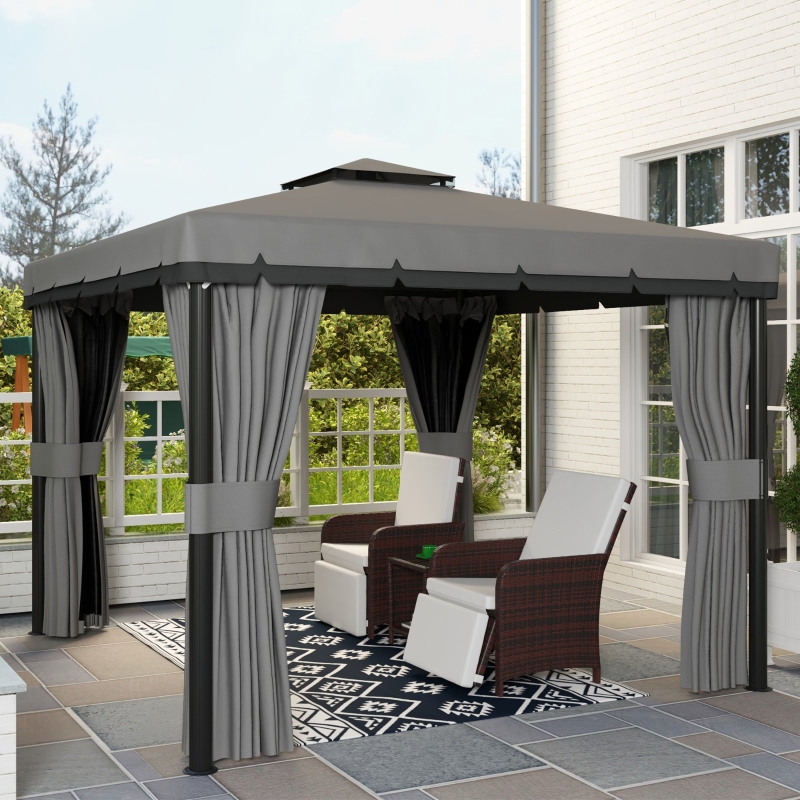 DOUBLE-TIER ROOF CANOPY: Double layer to help promote airflow in and out, helping to keep the garden gazebo as cool as possible. The gazebo canopy protects the inside gazebo from light rain and direct sunlight. Eight grommet holes to prevent water building up. || CURTAINS, WITH NETTING: Four curtains to create an open or private atmosphere when you want. Removable inner netting helps protect you from annoying bugs and insects when using this steel frame gazebo. || ALUMINIUM AND STEEL FRAME: Blended metal frame of the patio gazebo is extremely strong: it’s sturdy and resistant to light weathering for prolonged wear. || ACCESSORIES INCLUDED: 8 x ground nails and 8 x expansion screws, keeping the gazebo with sides standing as steady as possible. || DIMENSIONS: 2.65H x 2.96L x 2.96Wm. Eaves: 1.95Hm. ASSEMBLY REQUIRED. NOTE: Not recommended for use in extreme weather conditions such as storms or heavy winds/rain.