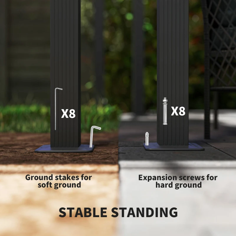Retractable roof: Move the PU-coated fabric to a position you want – garden pergola can keep you safely shaded or exposed and enjoying the sun. || Aluminium frame: A strong and rust-resistant structure, pergola kit stands steady in place. Eight ground nails and eight expansion screws included to secure to ground. || Grommet holes on canopy: Allow water to drain, doesn’t build up on garden shelter roof – won’t damage the material or potentially fall on you. || Versatile: Metal pergola is suitable for all outdoor spaces. An chill area, an extended dining space and more. || Dimensions: 237H x 395L x 296Wcm. Column spacing: 340L x 243Wcm. Do not leave up in extreme weather conditions.