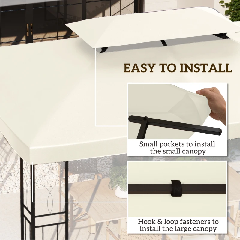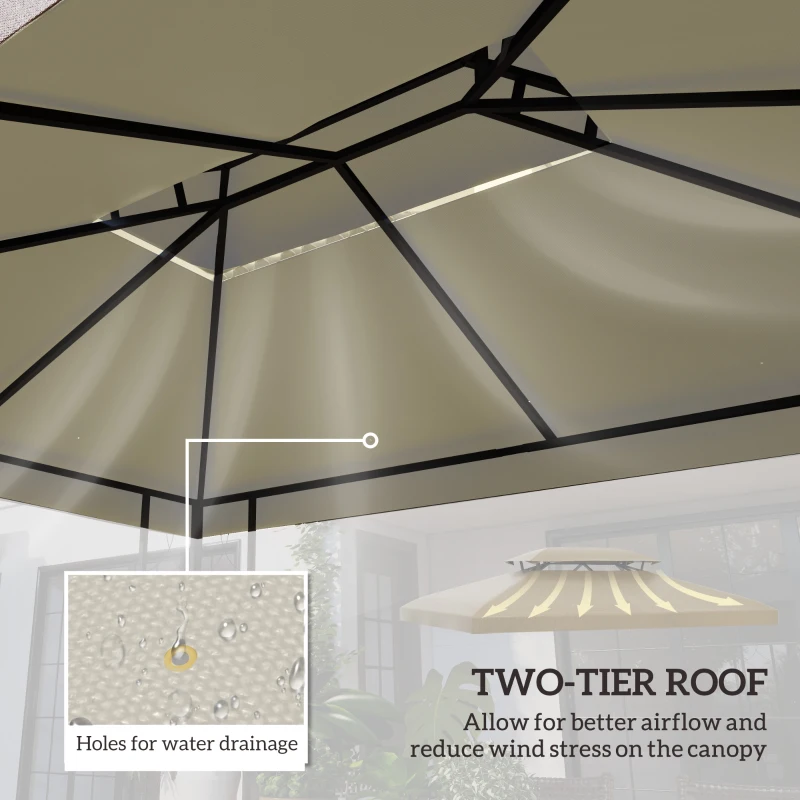 REPLACEMENT GAZEBO COVERS: Our gazebo roof replacement can create a feeling of a new gazebo to extend its lifespan. Suitable for 2.9-3Wm x 3.9-4Lm size frames. || UV RESISTANT: This gazebo cover is made of durable polyester with a protective PA coating to shield against UV and light rain. Also lightweight and portable. || TWO-TIER ROOF: Two-tier roof design of the replacement gazebo canopy allows air to enter and leave, helping to keep the inside cool. Also features ten holes for water drainage. || PRACTICAL: The gazebo replacement roof has velcro-style straps to attach and remove the cover quickly and easily. || DIMENSIONS: 4L x 3Wm. NOTE: Before purchase, please measure all sides and bevelled edges to ensure a correct and secure fit.