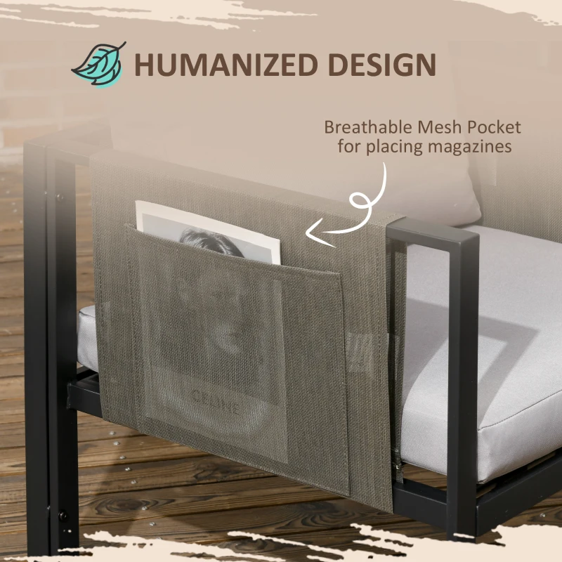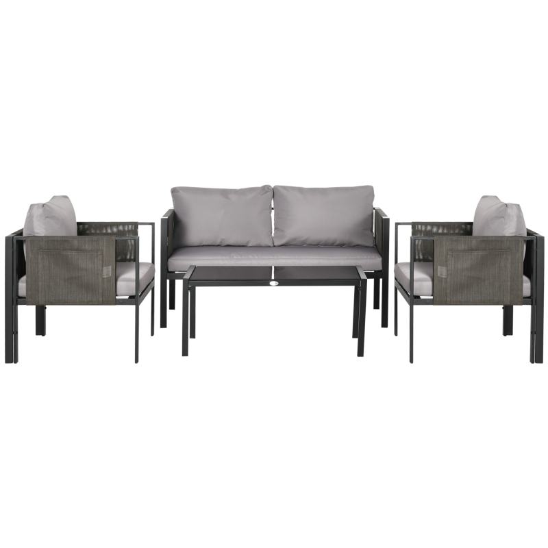 Four-piece set: Comes with two armchairs, a two-seater sofa and matching table. Relax outdoors with company. || Comfortable: Wide seats and high backs for support, with soft seat and back cushions. || Tempered glass tabletop: A sleek look in a solid formation. Space to hold items close by, within easy reach. || Steel structures: Metal garden furniture set is strong and supportive. || Dimensions: Chair: 61H x 66W x 62.5D cm. Sofa: 61H x 123W x 62.5D cm. Table: 38H x 88W x 46D cm. Assembly required.