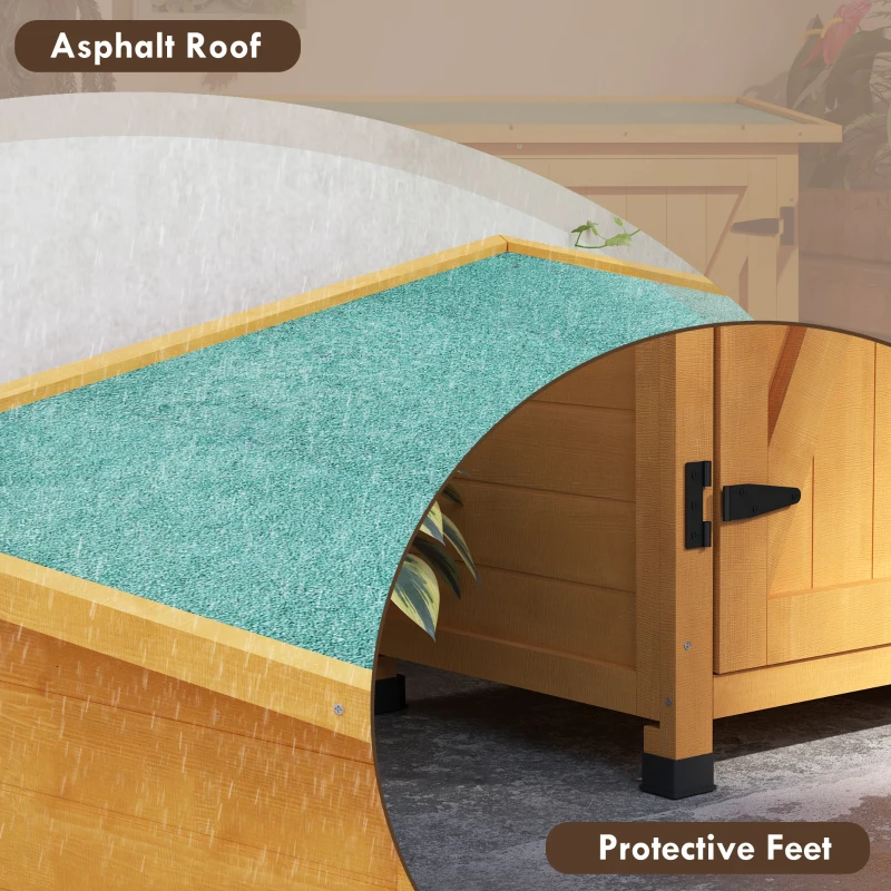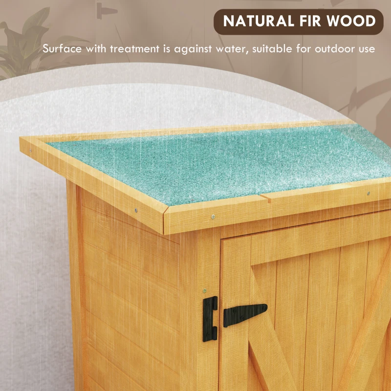 Compact design, with two shelves: This outdoor storage cabinet is great for fitting into smaller spaces without compromising on storage space. Spacious enough for tools, equipment and small outerwear. || Fir wood structure: A strong piece, a safe shelter for inner items, finished with a coat of water-resistant paint. Use a cover during the colder months for prolonged use. || Tilted asphalt roof: Covering protects inside from rainwater and liquids seeping through. Opens up too. || Two doors: Easy access inside, with two metal handles on this garden storage to open easy. || Dimensions: 117H x 110L x 55Wcm. Floor Space: 0.45105m². Maximum load 15kg per shelf. Easy to assemble.