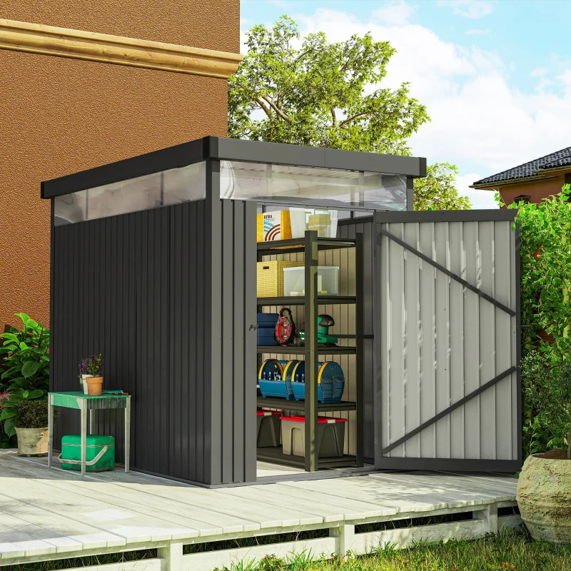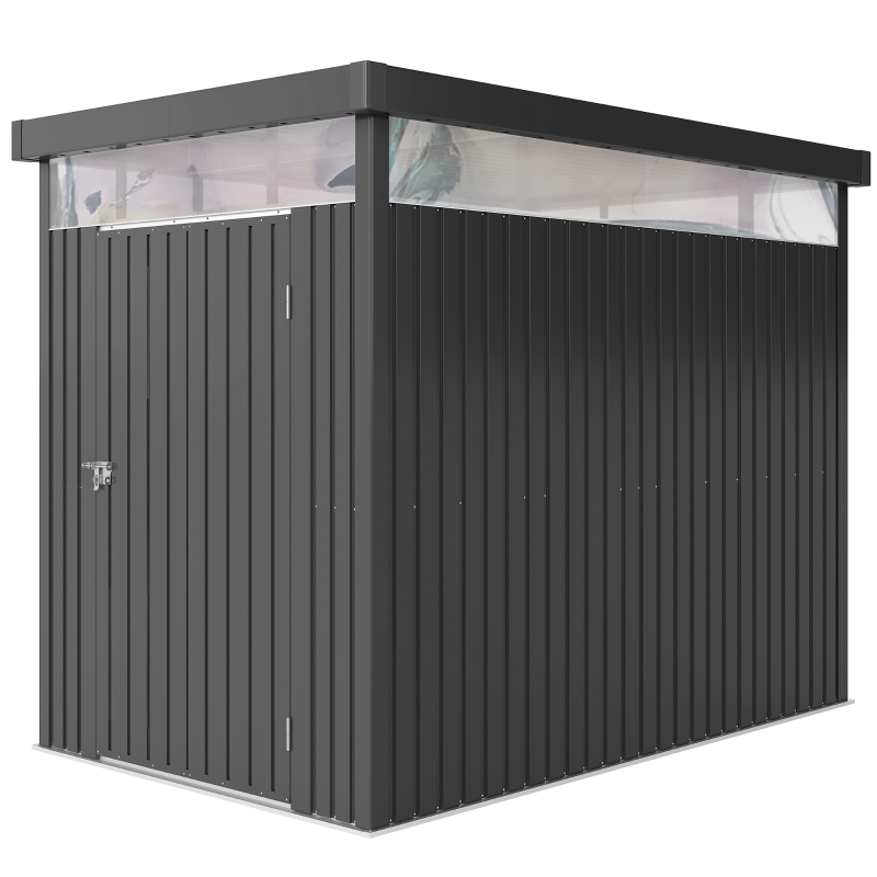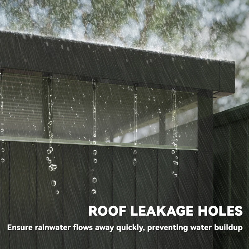 Spacious storage: With a spacious 1.5W x 2.4D m interior, our metal garden shed offers plenty of room to securely store all your garden tools, equipment and outdoor essentials – keeping your space organised and clutter-free. || Natural lighting: Thanks to the built-in acrylic roof windows, this garden storage shed is naturally well-lit, making it easy to find what you need, even on cloudy days. No more fumbling in the dark! || Rain-Ready Design: Designed with water leakage holes, our storage shed ensures rainwater flows away quickly, preventing any water buildup inside. Your belongings stay dry and safe. || Galvanised steel structure: Made from galvanised steel, this outdoor shed resists blistering, cracking and warping, ensuring long-term reliability in your garden. || Secure and accessible: Features a 75 cm wide door with a lock for secure access. Overall dimensions: 162W x 259D x 201H cm. Gloves included to use during setup. 2-3 people recommended to build.