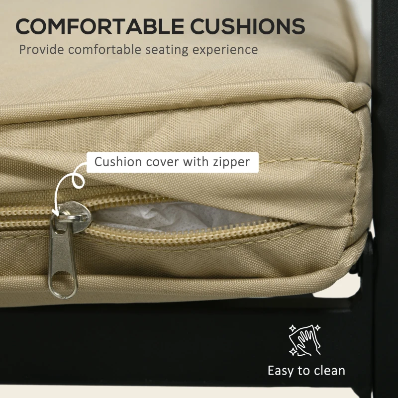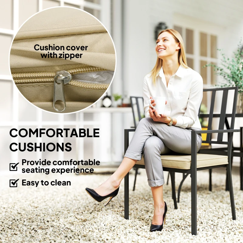 Five-piece garden dining set: Comes with four armchairs and a square dining table. Seat cushions on chairs for comfort, with removable and washable covers. || Parasol hole table: Φ50mm size is suitable for Φ38-Φ48mm poles. Keep safely shaded as you relax in outdoor dining set. || Steel structure: Strong and tough garden table and chairs, suitable for outdoor use. Matte finish for a minimal look. || Stacking chairs: Space-saving feature – won’t take up much space when metal garden furniture set isn’t being used. || Dimensions: Table: 71H x 94L x 94Wcm. Chair: 89H x 57W x 58Dcm. Chairs stacked: 98H x 57W x 67Dcm. Maximum load: Table: 50kg. Chair: 120kg. Assembly required.