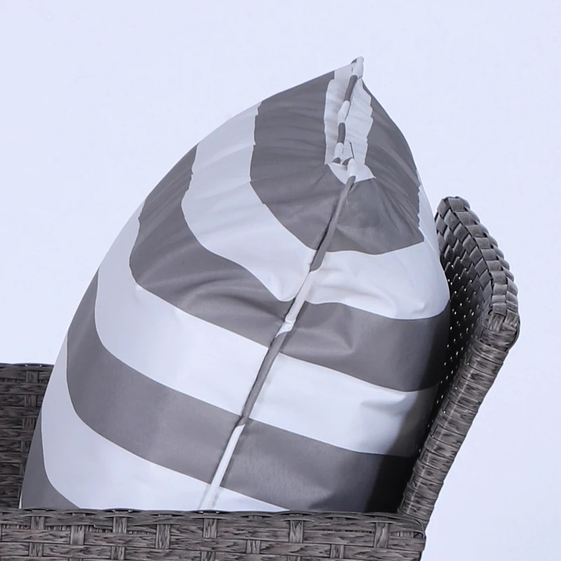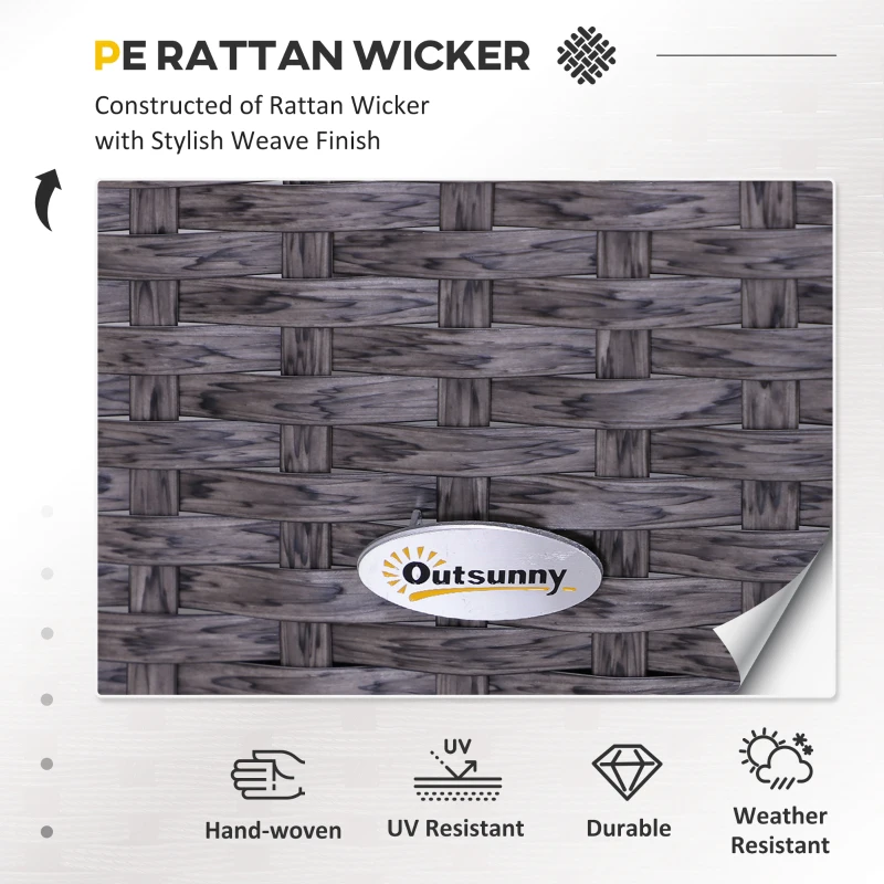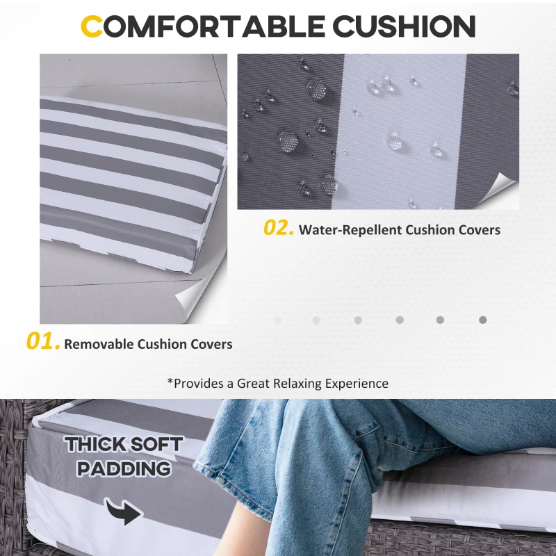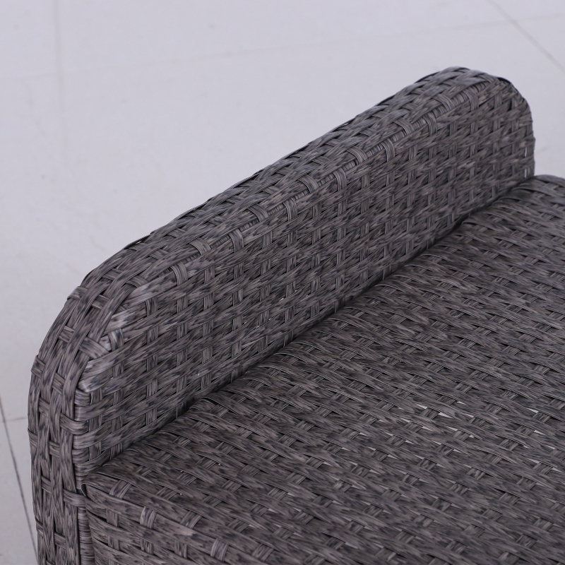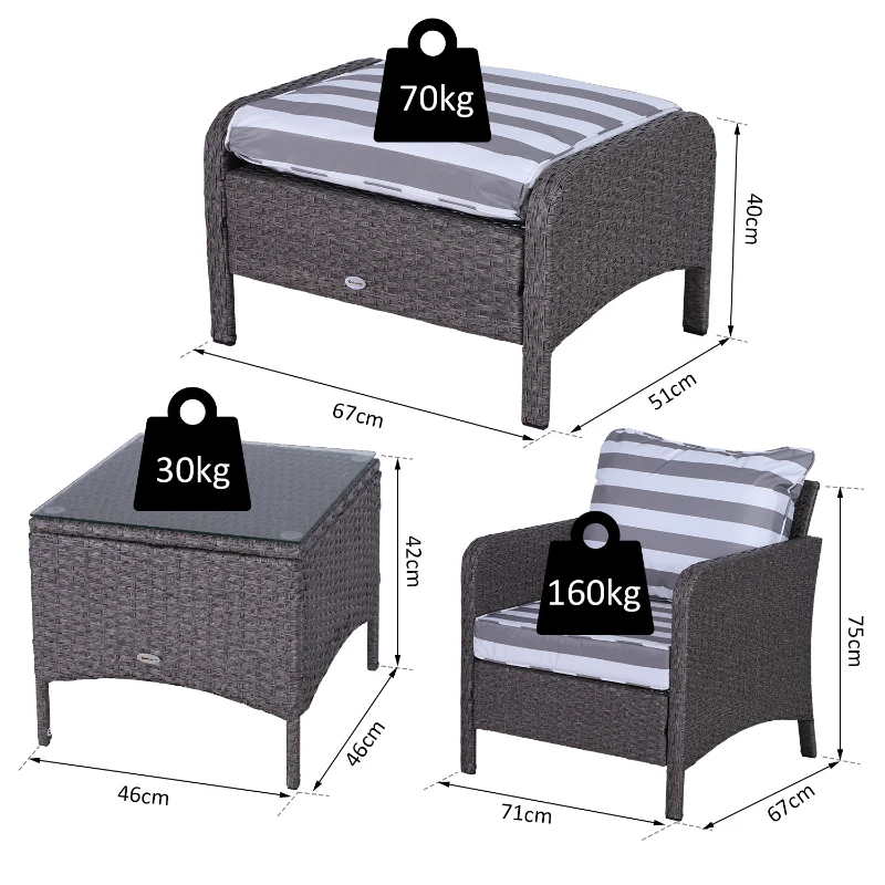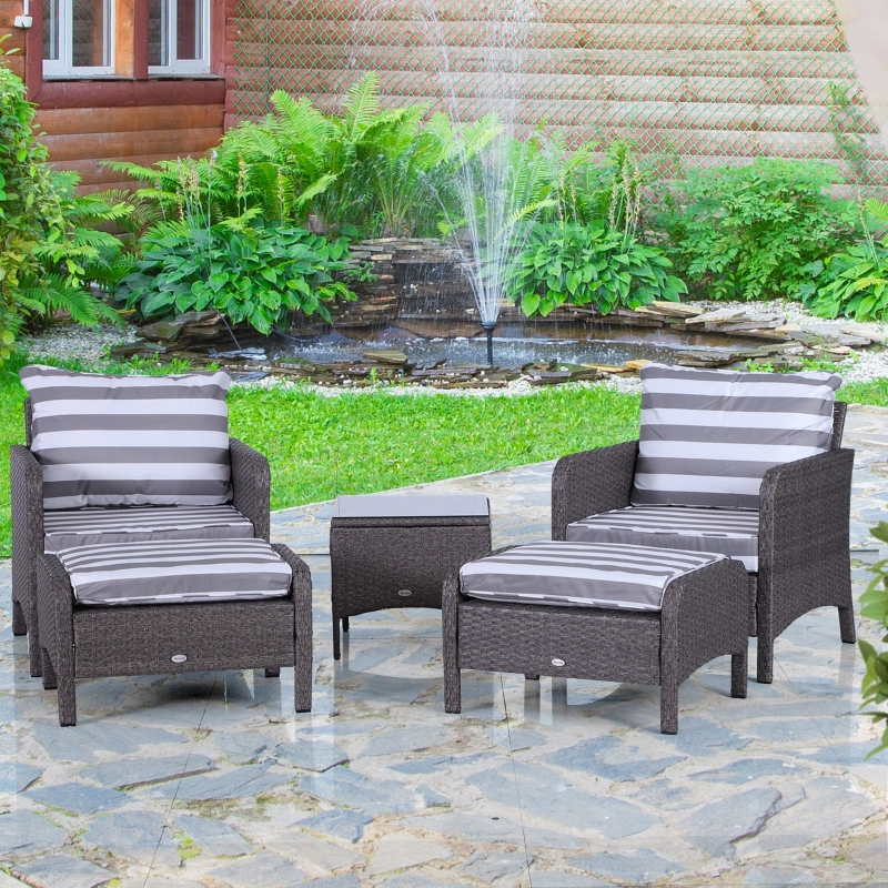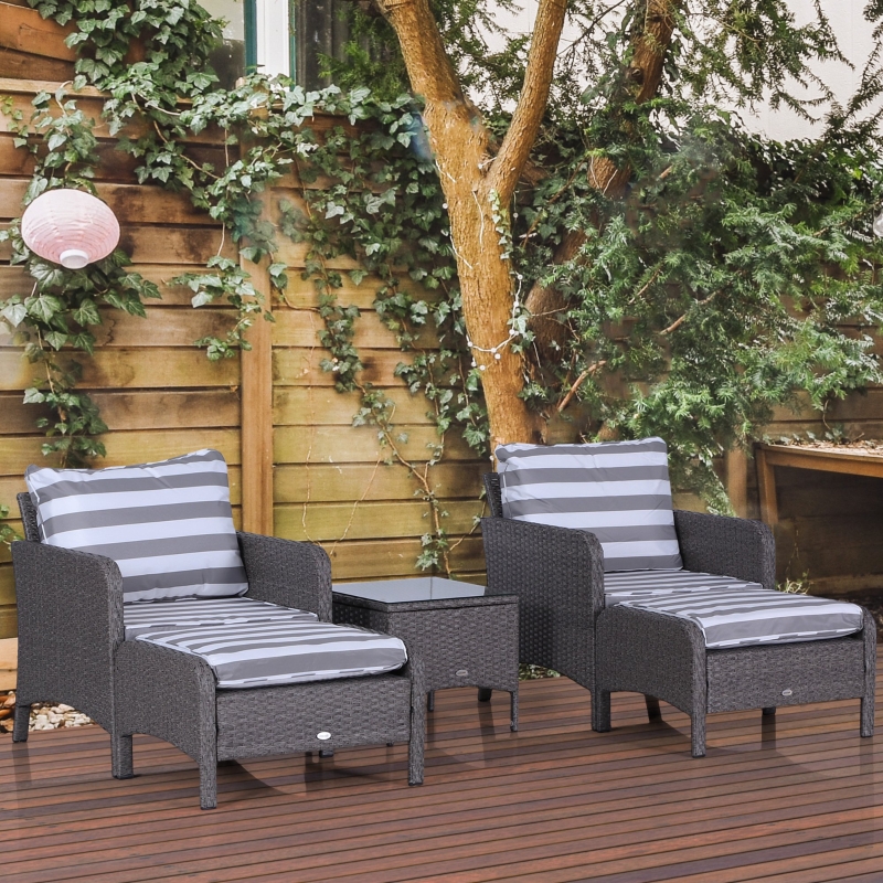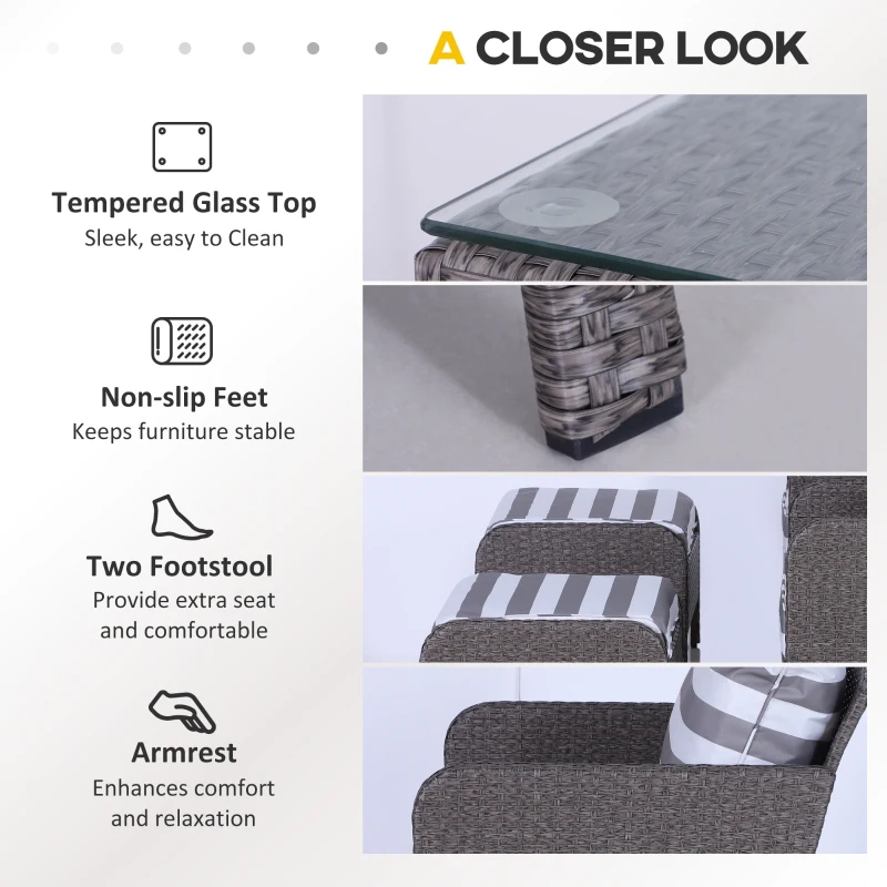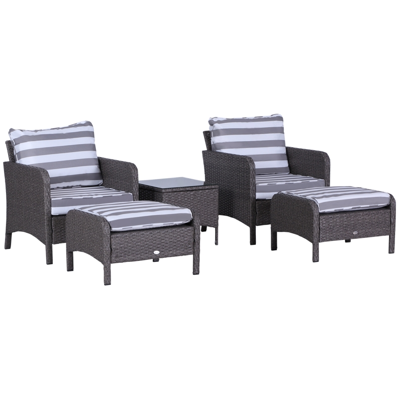 Five-piece set: The rattan sofa set includes two armchairs,two footstools and a coffee table. The garden sofa set is a wonderful addition to gardens, balconies and other outdoor spaces in your home. || Comfortable cushions: The rattan garden chair come with 10cm thick and plush padded seat and back cushions and footstools to ensure hours of wonderful relaxation. Cushion covers can be removed and washed to keep them clean. || Metal wrapped in rattan: The comfy garden chairs are made of steel frame with a powder-coated process to ensure a strong and stable base, with PE wicker wrapped around for protection against mild weathering and fading. || Glass table top: The table of the garden furniture is with a sleek and smooth tempered glass top for a reliable holding place to keep everything near. || Dimensions: Armchair dimension: 67W x 71L x 75Hcm; Footstool dimension: 51W x 67l x 40Hcm; Tea table dimension: 46W x 46D x 42Hcm; Seat to floor: 30cm. Assembly required.