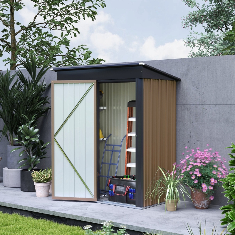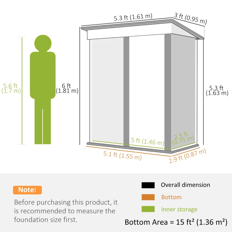 5 x 3ft size: A slightly small shed, offering moderate room for tools, equipment and more. Two inner adjustable shelves. Gloves included for set-up! || Lean to shed design: Position against a wall/something similar – keeps it supported and steady – this garden shed extends current storage space. || Corrugated steel structure: A strong metal shed structure, suitable for outdoor use. Foundation kit included, not floor. || Single door, with lockable door: Easy to enter and leave this garden storage shed. Lock and keys included. || Dimensions: 161W x 95D x 163/181Hcm. Inner: 146W x 75Dcm. Bottom Dimension: 155W x 87D cm, 1.36 m². Assembly required. Three people required for installation in approx. three hours – ALWAYS wear gloves. Do not build during windy weather conditions.