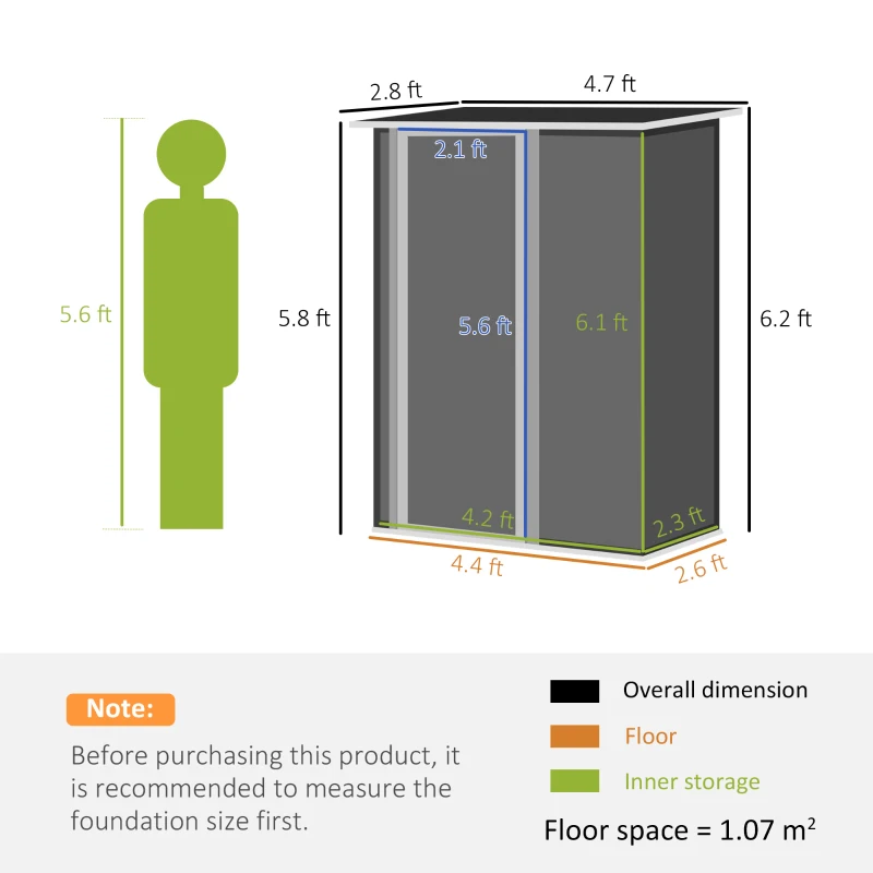Open inner storage: This outdoor shed provides plenty of room in your garden for keeping tools, equipment and anything you need to be kept dry and protected. Foundation kit NOT included. || Steel frame: Galvanised shed for extra strength, provides a stable structure, with a weather-resistant top coating for reliability outdoors. || Sloped roof: Prevents any liquids building up and stagnating to rot or rust the garden storage shed. || Lockable Hinged door: Allows easy access in and out this lean to shed. It can be locked with a latch for added security. || Dimensions: 189H x 142L x 84Wcm. Inner: 128L x 69Wcm(1.07㎡). Door: 171H x 63Wcm. Assembly required: All pre-cut and pre-drilled parts included. Three people required for installation in approx. three hours – ALWAYS wear gloves.
