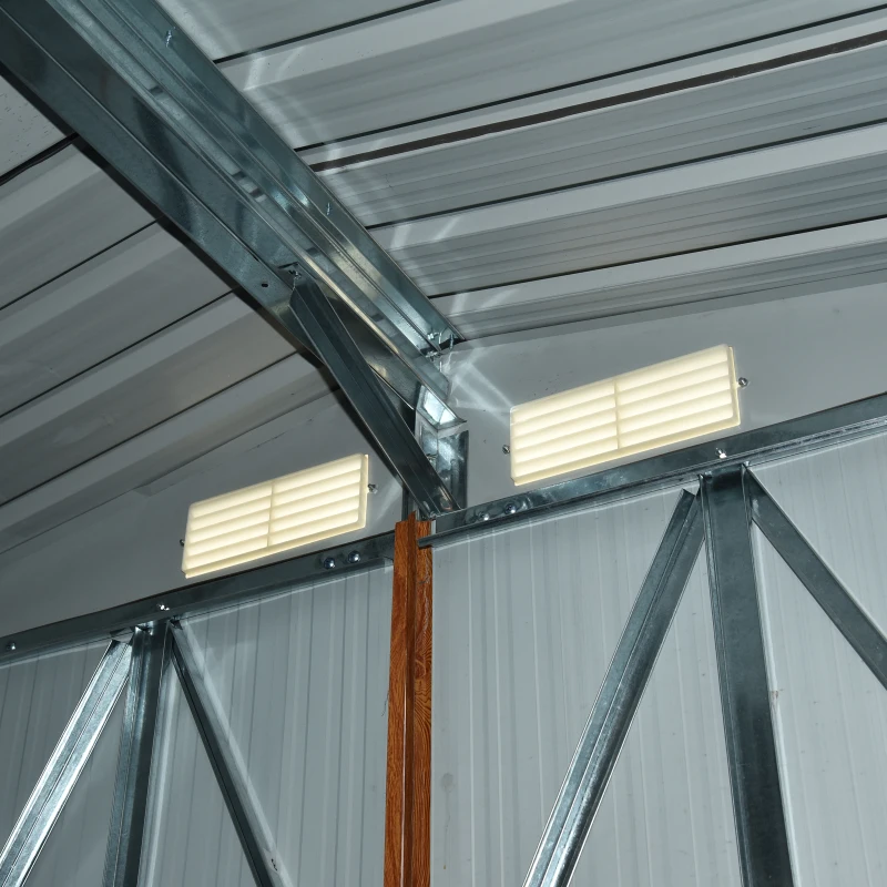 Large metal shed: Plenty of storage room for your lots of tools, equipment and garden furniture. The natural wood grain outlook is well suited for outdoor use. || Steel frame: Galvanised shed for stable, weather resistant and long-lasting use. || Double sliding doors: The sliding design provides convenient access inside. And it’s lockable for safety when you’re not at home; the double-door shed allows easy access and keeps everything out of sight. || Sloping roof: Allows water to roll down to the ground, preventing buildup, stagnation and rust damage to this outdoor shed. VENTILATION SLOTS: Two windows on the front allow air to circulate around inside, preventing any moisture and mildew buildup on your tools and equipment. Your bike can be stored without rusting. || Dimensions: 197L x 163W x 200H cm. Garden Tool Shed Insider: 2.68m². Door: 73W x 171H cm. ASSEMBLY REQUIRED: All pre-cut and pre-drilled parts included. Three people required for installation in approx. four hours – ALWAYS wear gloves. Do not build during windy weather conditions.