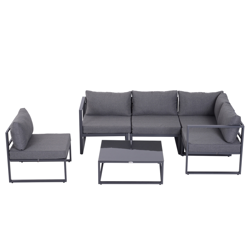 SIX PIECE GARDEN DINING SET: Includes three corner seats, two middle seats and a matching coffee table. || COMFORTABLE: Thick padded cushions for all day-relaxation. || ALUMINIUM FRAME: Keeps each piece strong and stable all-year round. UV and fade resistant. || TEMPERED GLASS TABLETOP: Adds a slick finishing touch and can be wiped clean easily. || EASY TO MAINTAIN: Cushion covers can be removed and washed for a fresh look all-year round. DIMENSIONS: Middle chair: 65L x 65W x 63Hcm. Corner chair: 65L x 65W x 63Hcm. Table: 75L x 70W x 30Hcm. MAXIMUM WEIGHT CAPACITY: Chair: 160kg. Table: 30kg. ASSEMBLY REQUIRED.