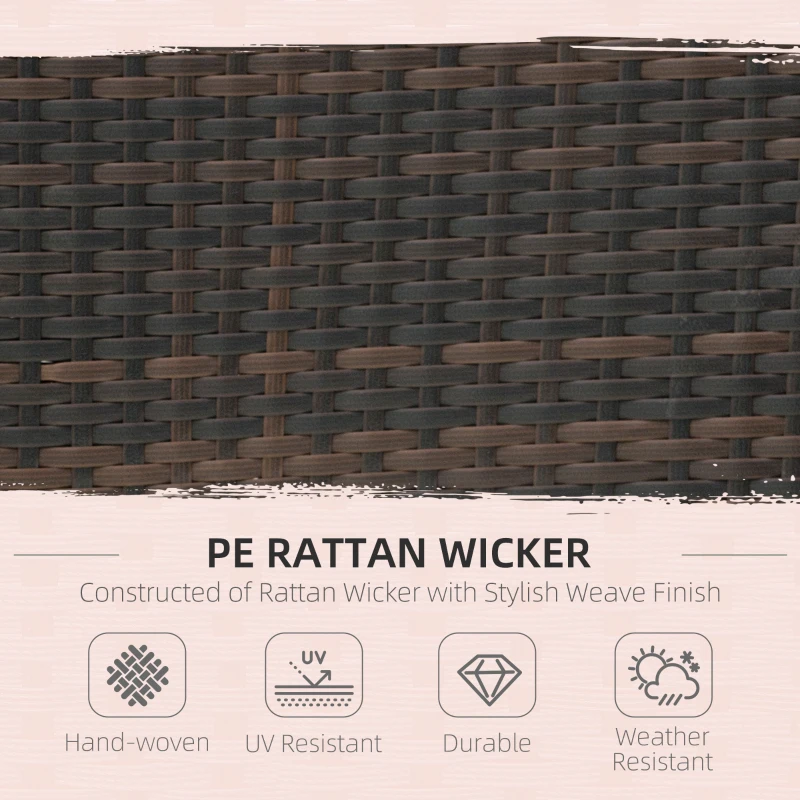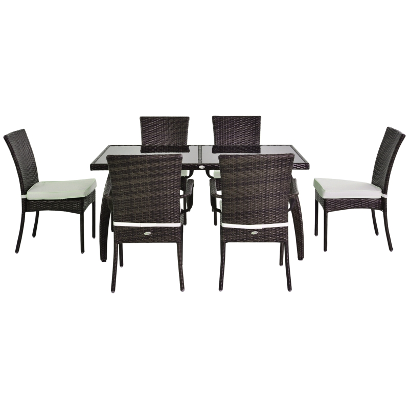 SEVEN-PIECE DINING SET: The perfect rattan outdoor dining set to have all your guests gathering round together, consists of a large dining table, four armchairs and two single seats, – room to bring everybody together outdoors. || STEEL WRAPPED IN RATTAN: Galvanised for extra strength and resistance to rusting, the rattan dining sets ensure a strong and stable base, with the PE wicker making it sturdy, durable, easy to clean and resistant to UV and light water damage || COZY CUSHIONS: The cushion covers and stuffing of the rattan table and chairs are made of polyester fabric, which is waterproof and anti-UV, and is very elastic and not prone to inelastic deformation || TEMPERED GLASS TABLE TOP: Brings a sleek look to the corner dining table set and provides a solid surface to dine from. Smooth finish, wipes clean easily. || MAXIMUM LOAD WEIGHT: Chair: 180kg. Table: 80kg. ASSEMBLY REQUIRED.