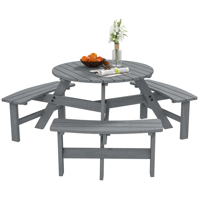 Multiple-use: 3-seater patio table and chairs are suitable for outdoor, patio, garden or cafe style use. || Slatted design: The slatted tabletop and seats allow water to flow down to keep it away from rot so that it has a longer lifespan. || Strong construction: Thick dining table set for 6 with great strength supports weights up to 227 kg for the bench and 50 kg for the table. || Parasol hole included: The patio furniture set features a space for parasol in the middle with precision cut hole for shade in summer days. || Overall dimension: Ф178 x 70H cm. Assembly required. Note: Parasol is not included.