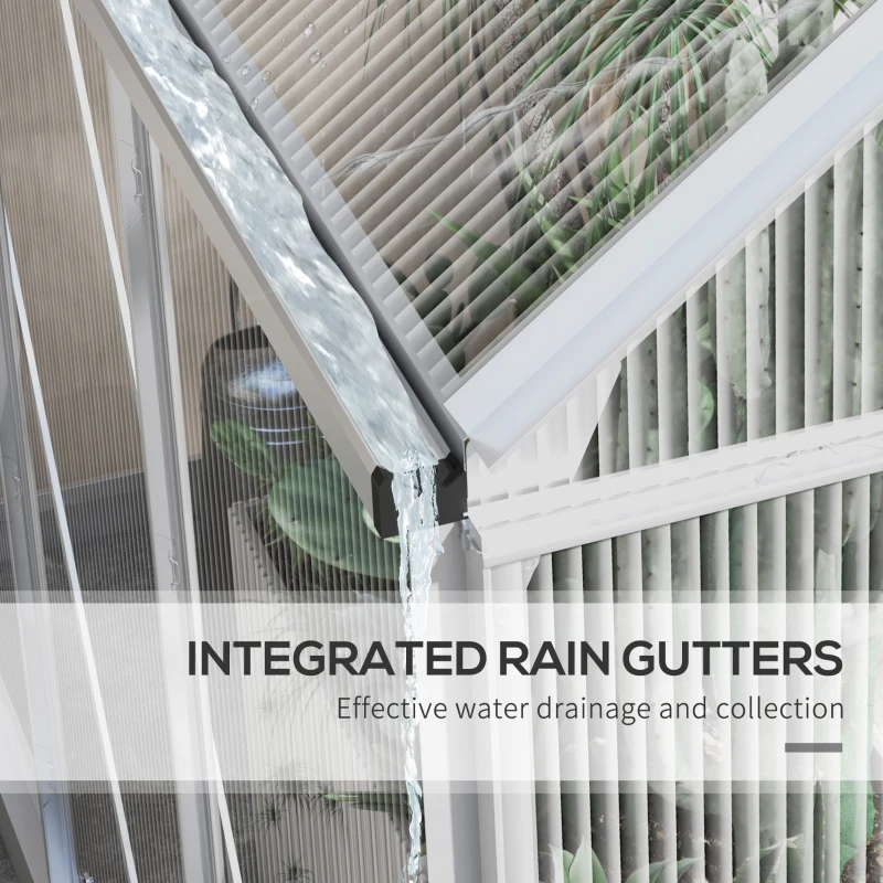 190 x 193cm: Polycarbonate greenhouse provides plenty of room for growing plants, vegetables, crops and flowers safely and healthily. || Aluminium Frame: Heavy duty outside greenhouse made of rust-resistant aluminium with multiple reinforcement bars at sides and top, ensures a reliable structure which is naturally strong in low temperatures. || Sliding door: Easy access, opens and closes smoothly. Window which can be set to five different positions for control of air flow in the conservatory. || Polycarbonate panels: Large greenhouse protects inside crops from water, wind and UV from direct sunlight, giving them better growing conditions. Integrated rain gutters on the bottom are effective for water drainage and collection. || Dimensions: 205H x 193W x 190Dcm. Foundation: 12H x 190W x 190Dcm. Door: 165H x 62.5Wcm. Snap-in assembly: Simply place the PC panels onto the frame, secure with the clips and reinforce with included screws.