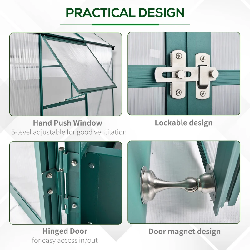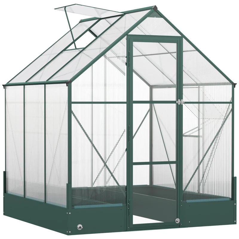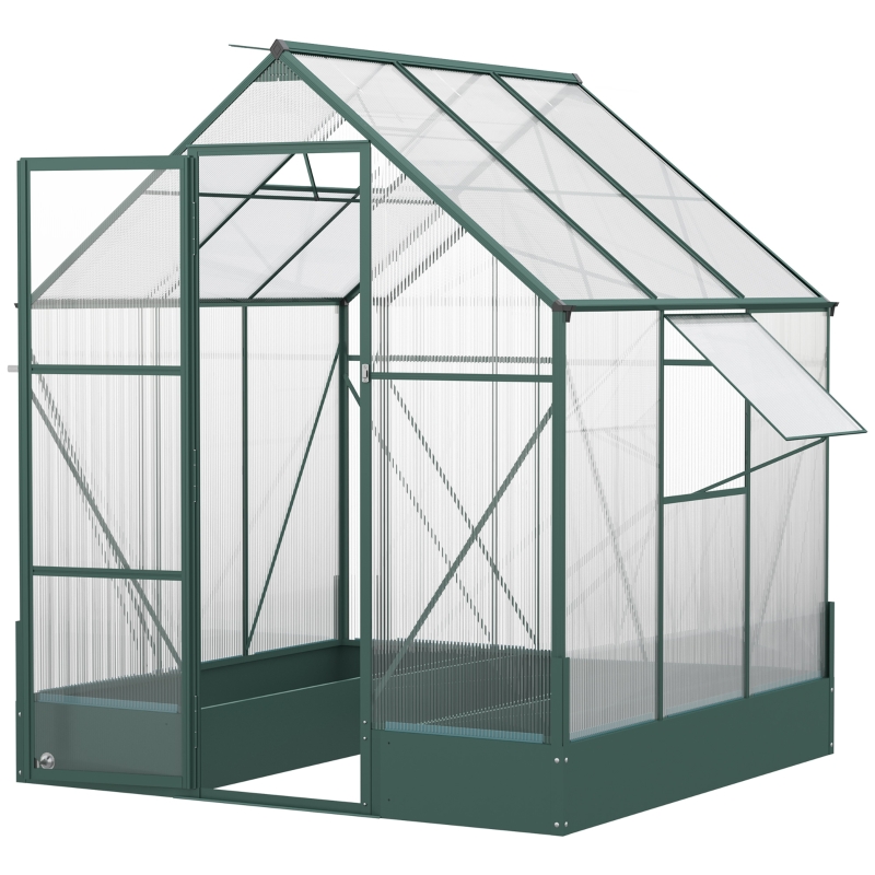 LARGE SIZE: Large greenhouse to give you plenty of growing room for plants, vegetables and more. With 2 garden beds, you can manage different plants more conveniently in this polycarbonate greenhouse || SMART WINDOW: Temperature controlled to open and close automatically, ensures the growhouse inside is not too hot and allows air to circulate inside when you are not around. Open the 6×6 greenhouse for plants when the temperature is higher than 16„ƒ. || ALUMINIUM FRAME: Naturally lightweight yet robust and resistant to rusting, it keeps the green house for garden structure in shape. POLYCARBONATE PANELS: Tough outside greenhouse panels which keep the heat in and allow sunshine to pass through the hobby greenhouse. 30um resistance to protect your crops from harsh UV. || EASY ACCESS: Fitted with a hinged door and window which can be fixed to five different angles. Integrated rain gutters of the polycarbonate green house are effective for water drainage and collection. || ASSEMBLY REQUIRED: Foundation is included. The detachable greenhouse aluminium foundation can be used in 2 ways: The foundation can be installed down to insert deeply into the soil or install it upward to stabilize the walk in greenhouse.