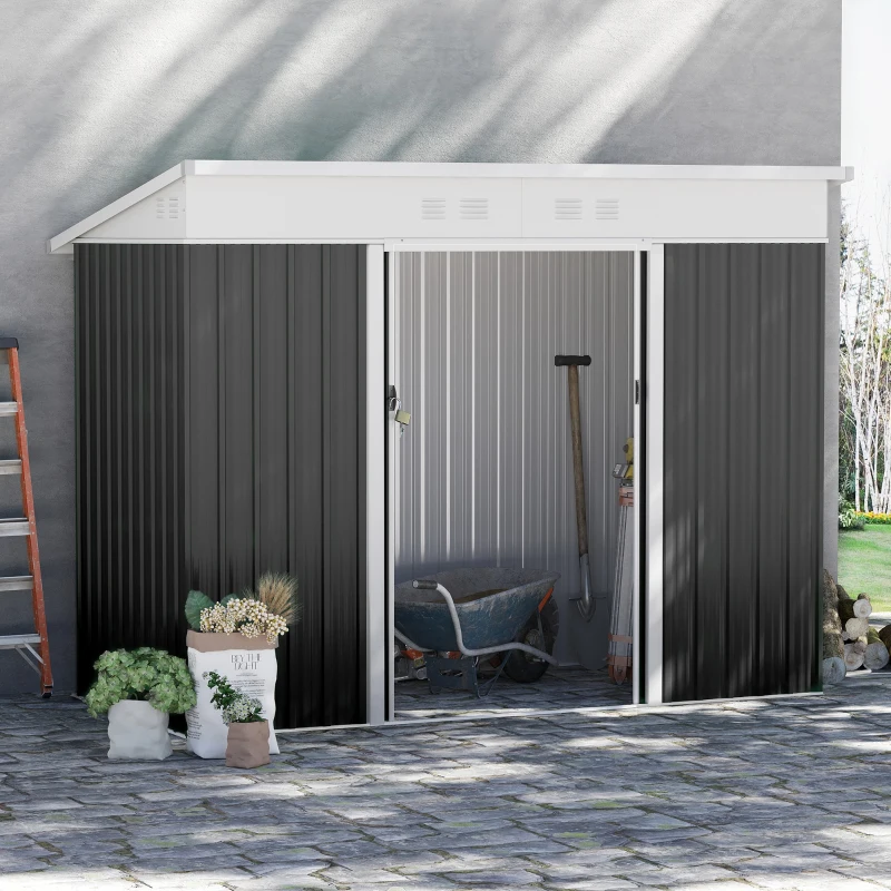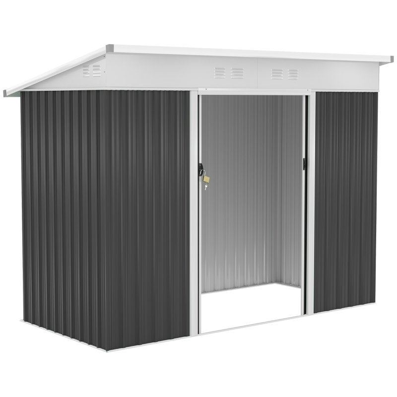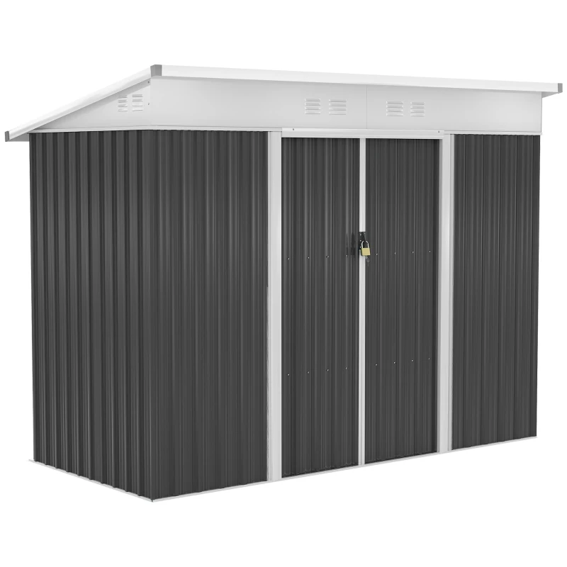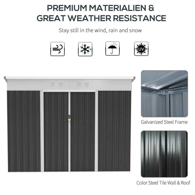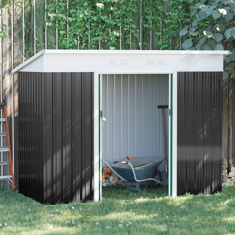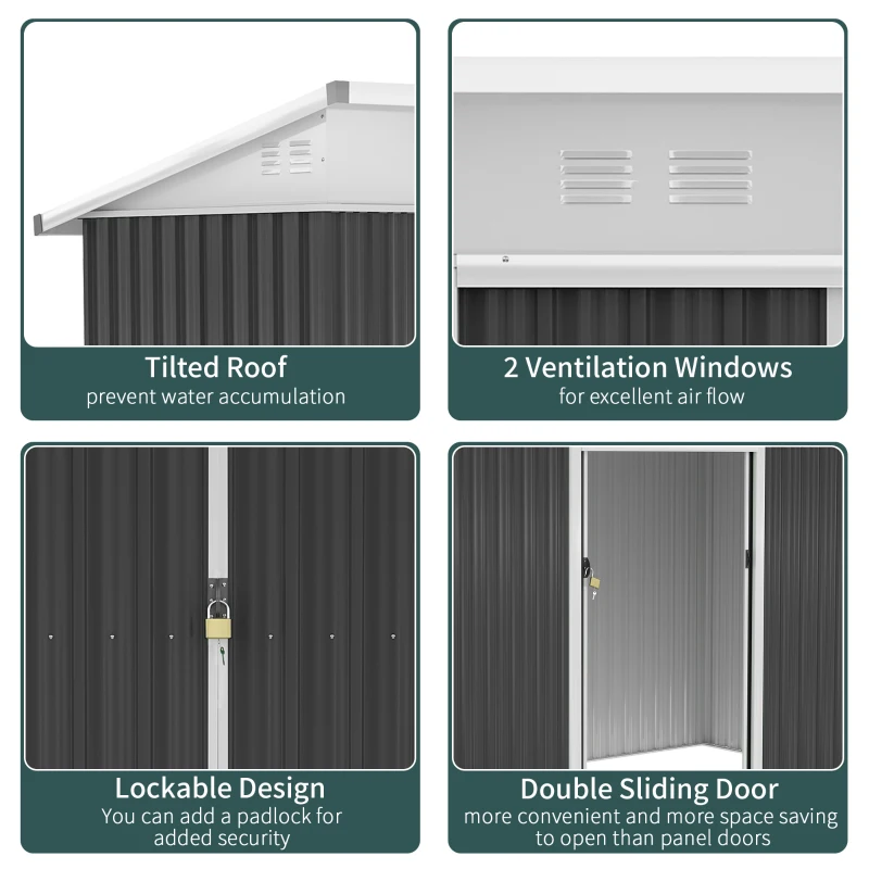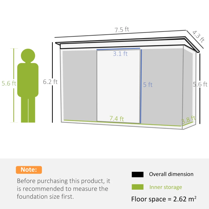 Large garden shed: Keeps your gardens and outdoors clean, ideal for storing tools, garden equipment, outerwear and furniture. || Steel structure: A tough-built metal shed that protects your shed against sunlight and rain. Layer of film for extra protection. || Two ventilation slots: Keeps inside cool and aerated; SLOPING ROOF: Prevents rain water from building up and damaging the garden tool storage shed. || Double doors: Slides open for easy access in and out this outside storage shed. Fitted with a lock. || Dimensions: Overall: 230L x 130W x 190H cm. Inner storage: 226L x 116Wcm. ASSEMBLY REQUIRED. Three people required for installation in approx. four hours – ALWAYS wear gloves. Do not build during windy weather conditions.