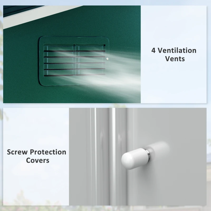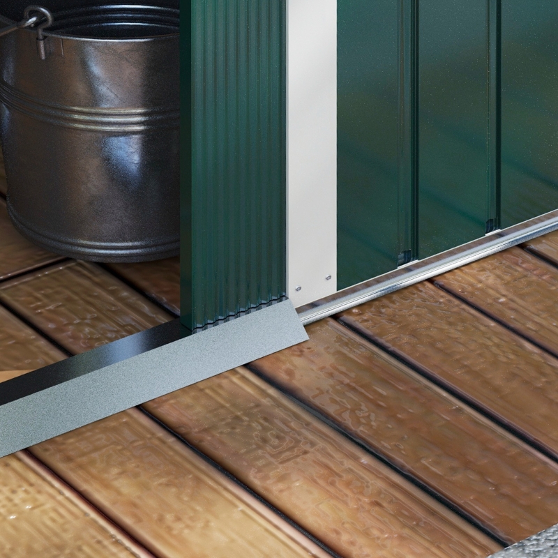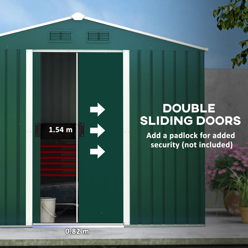Spacious storage: Lots of room for garden tools, equipment, furniture and outerwear in this large metal garden shed. || Galvanised steel shell: A tough piece, suitable for use all-year round. Metal garden shed is resistant to rusting. || Four ventilation slots: Two on the front and two on the back, keeps metal garden storage inside cool and airy for freshness. || Double door shed: Slides open for easy access in and out this metal bike shed. Locks for extra security. || Dimensions: 190H x 236L x 174W cm. Assembly required – three people required for installation in approx. three hours – ALWAYS wear gloves. Do not build during windy weather conditions. Foundation kit is not included.